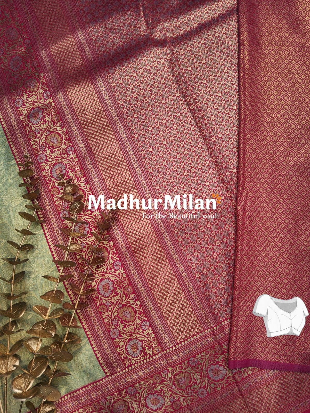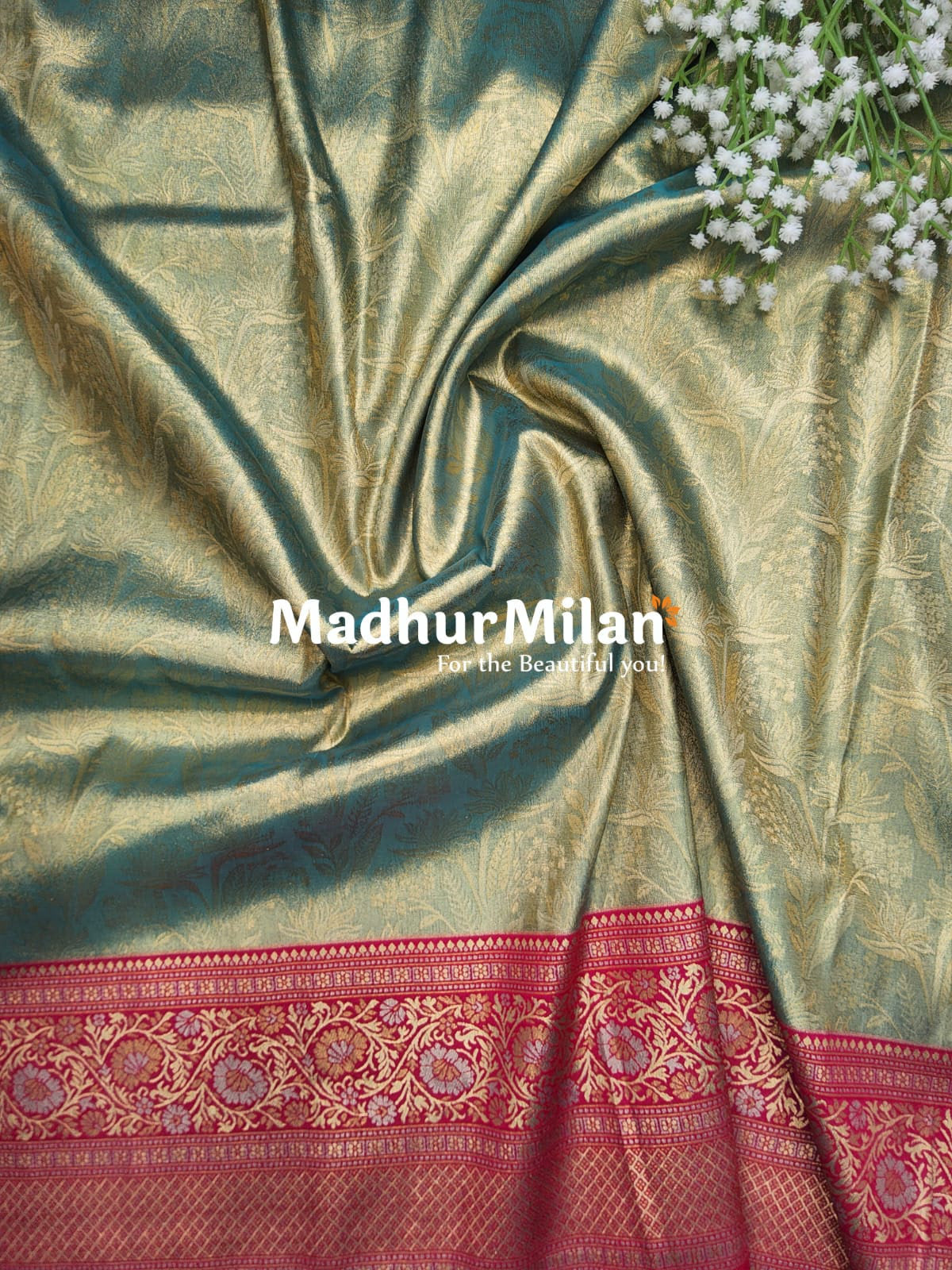 Description: Elevate your ethnic wardrobe with the exquisite INDRA Tissue Silk Saree in a stunning combination of golden green and pink. This luxurious saree, brought to you by Madhur Milan, is a perfect blend of tradition and elegance.