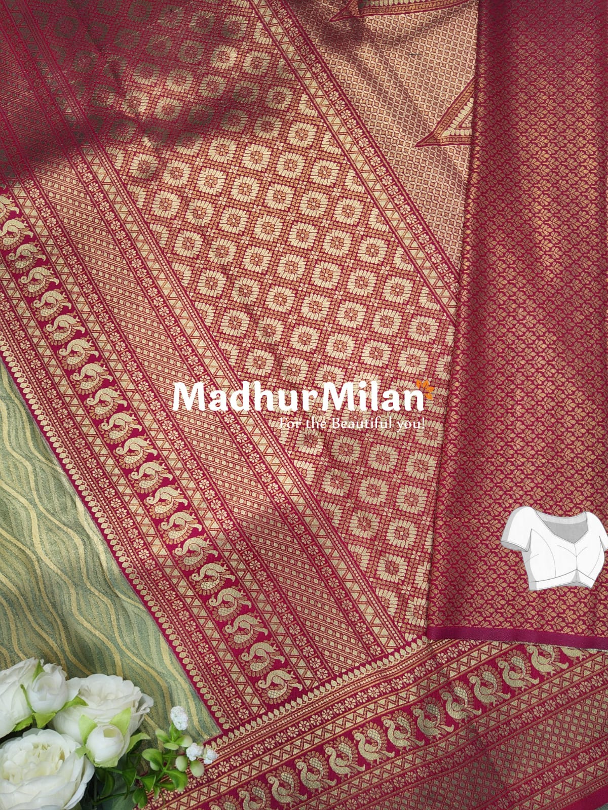 Details: - The body of the saree displays a sophisticated wave-like pattern in golden zari work against the dusty green background - The border features a series of peacock motifs, floral designs, and geometric patterns - The pallu is adorned with an array of square patterns, complemented by peacock motifs and intricate border designs Styling Suggestions: - Pair with a matching blouse (as shown in the image) for a coordinated look - Accessorize with golden jewelry to complement the zari work - Suitable for weddings, festivals, formal events, and special occasions