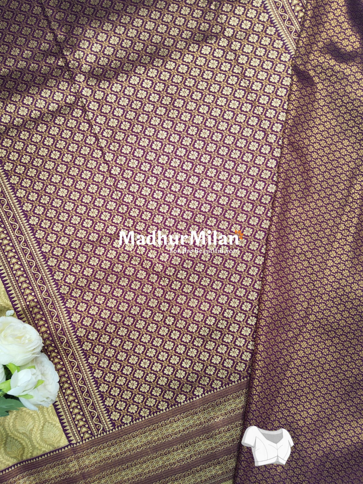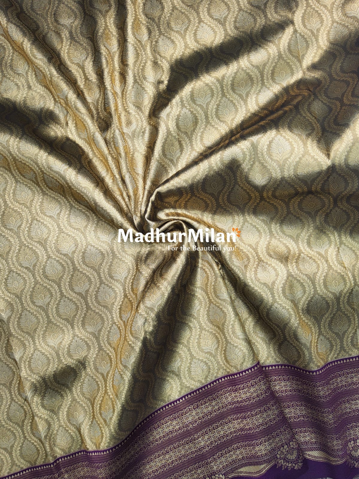 3. Design: - Body features an intricate peacock feather motif in a shimmering golden hue. - Purple border adorned with elaborate golden zari work in geometric patterns. - Pallu showcases a mesmerizing blend of purple and gold with traditional motifs.
