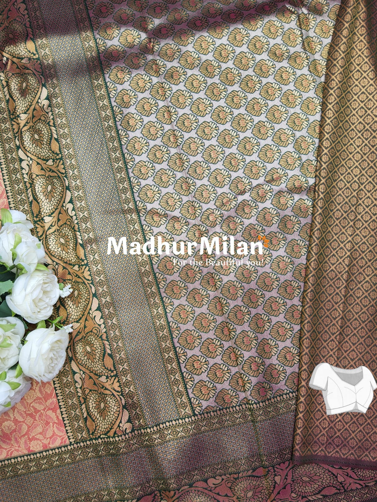Introducing the GANGOTRI TISSUE SILK SAREE DUSTY RED GREEN by Madhur Milan - a stunning blend of tradition and elegance for the beautiful you! This exquisite saree showcases the finest craftsmanship in tissue silk, featuring a mesmerizing dusty red body adorned with intricate golden floral motifs. The rich texture and subtle sheen of the fabric create a luxurious look that's perfect for special occasions.