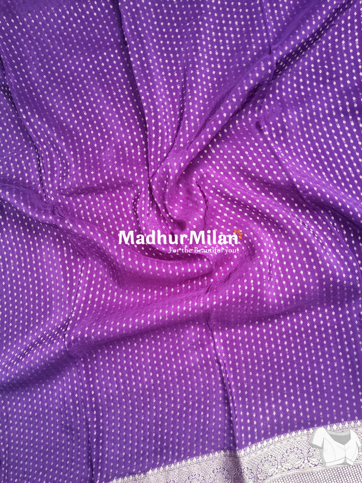 The saree's body features delicate self-embossed floral patterns that add a touch of refinement to the overall design. The contrasting silver zari work on the border and pallu creates a mesmerizing interplay of colors and textures, making this saree a true showstopper. The crepe silk fabric ensures ease of draping and a flattering silhouette, while the purple color symbolizes royalty and luxury. This MARVI Banarasi saree is a perfect blend of tradition and modernity, making it an ideal choice for the contemporary woman who appreciates the artistry of Indian textiles. Complete your look with matching accessories and step out in confidence, knowing you're wrapped in the beauty and grace of a Madhur Milan creation.