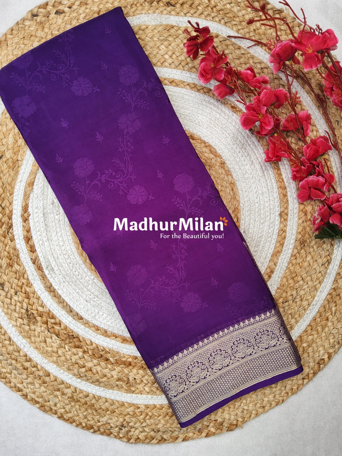 Product Description: MARVI BANARASI SELF EMBOSS CREPE SILK SAREE PURPLE Elevate your ethnic wardrobe with the exquisite MARVI Banarasi Self Emboss Crepe Silk Saree in a stunning purple hue. This masterpiece from Madhur Milan is crafted for the beautiful you, combining traditional artistry with contemporary elegance.