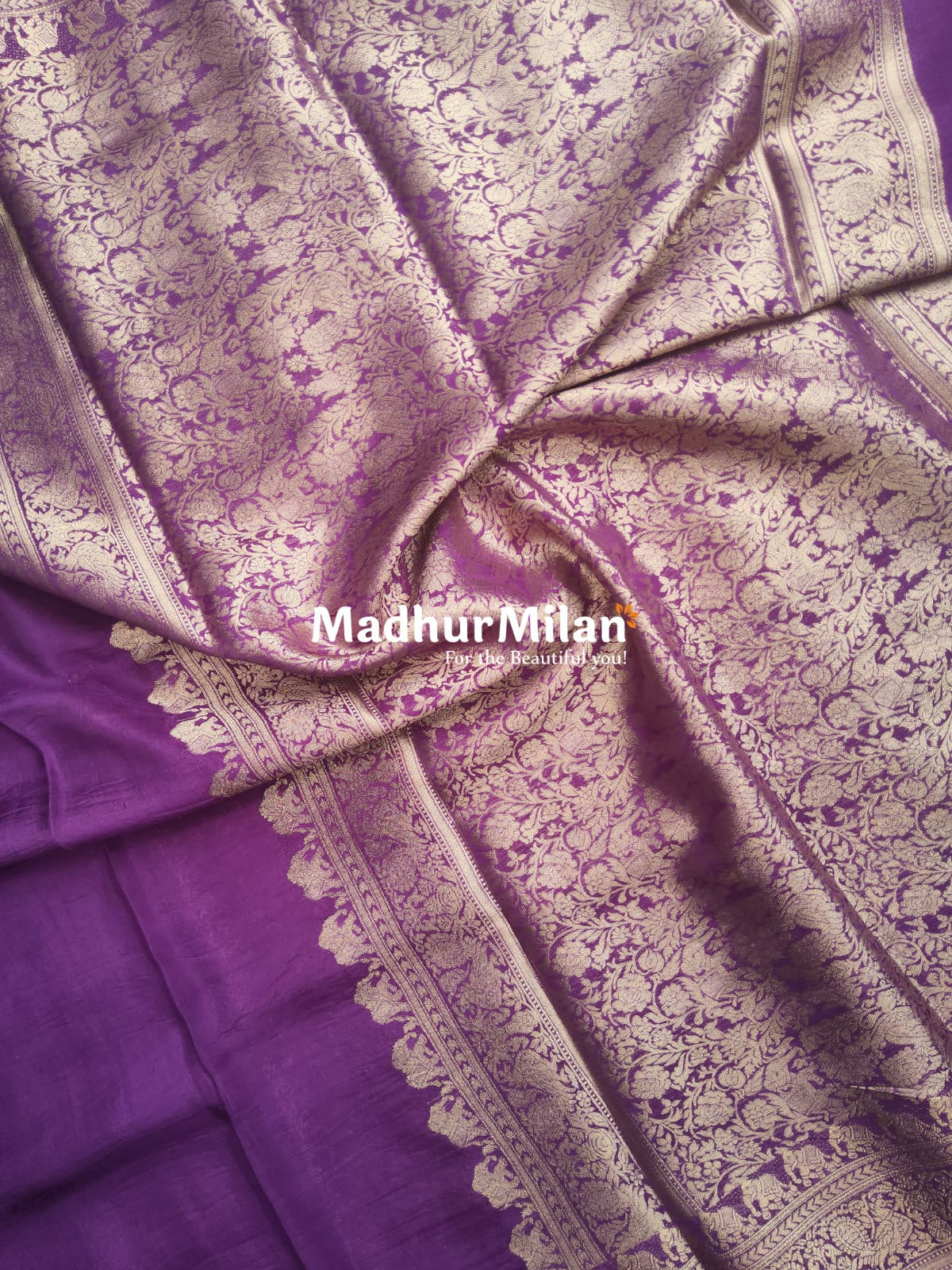 The saree's body features a mesmerizing light purple base adorned with delicate golden zari work, creating a harmonious contrast that catches the eye. The intricate patterns include beautiful floral and paisley designs, adding depth and sophistication to the overall look. The wide border is embellished with traditional motifs, including charming elephant designs, symbolizing good fortune and prosperity. The pallu is a true masterpiece, fully covered in opulent golden zari work that showcases the rich heritage of Banarasi weaving. This MISAKI BANARASI CREPE SILK SAREE is perfect for special occasions, festivals, and formal events. Its lightweight crepe silk ensures comfort and ease of draping, while the timeless design guarantees that you'll stand out in any crowd. Pair this stunning saree with golden accessories and a matching blouse to complete your regal look. Choose Madhur Milan for the beautiful you! Care