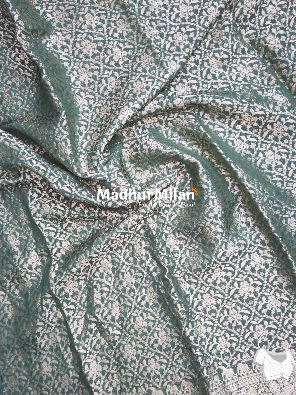 This saree is a testament to the rich heritage of Indian craftsmanship. The lush green background provides a perfect canvas for the intricate silver zari work, creating a mesmerizing contrast that catches the light with every movement. The all-over floral pattern adds a touch of romance and femininity to the ensemble. The border features a beautiful elephant motif, symbolizing strength and prosperity, making it not just a garment but a piece of art. The pallu is a showstopper with its elaborate silver zari work, displaying the full glory of Banarasi weaving techniques. Perfect for weddings, festivals, or any special occasion, this saree will make you stand out in the crowd. Its versatile color allows for easy accessorizing, while the crepe silk ensures comfort and a flattering drape. Embrace your beauty and grace with this MadhurMilan creation – a perfect fusion of tradition and contemporary style. Make a statement at your next event with the MISAKI BANARASI CREPE SILK SAREE GREEN.
