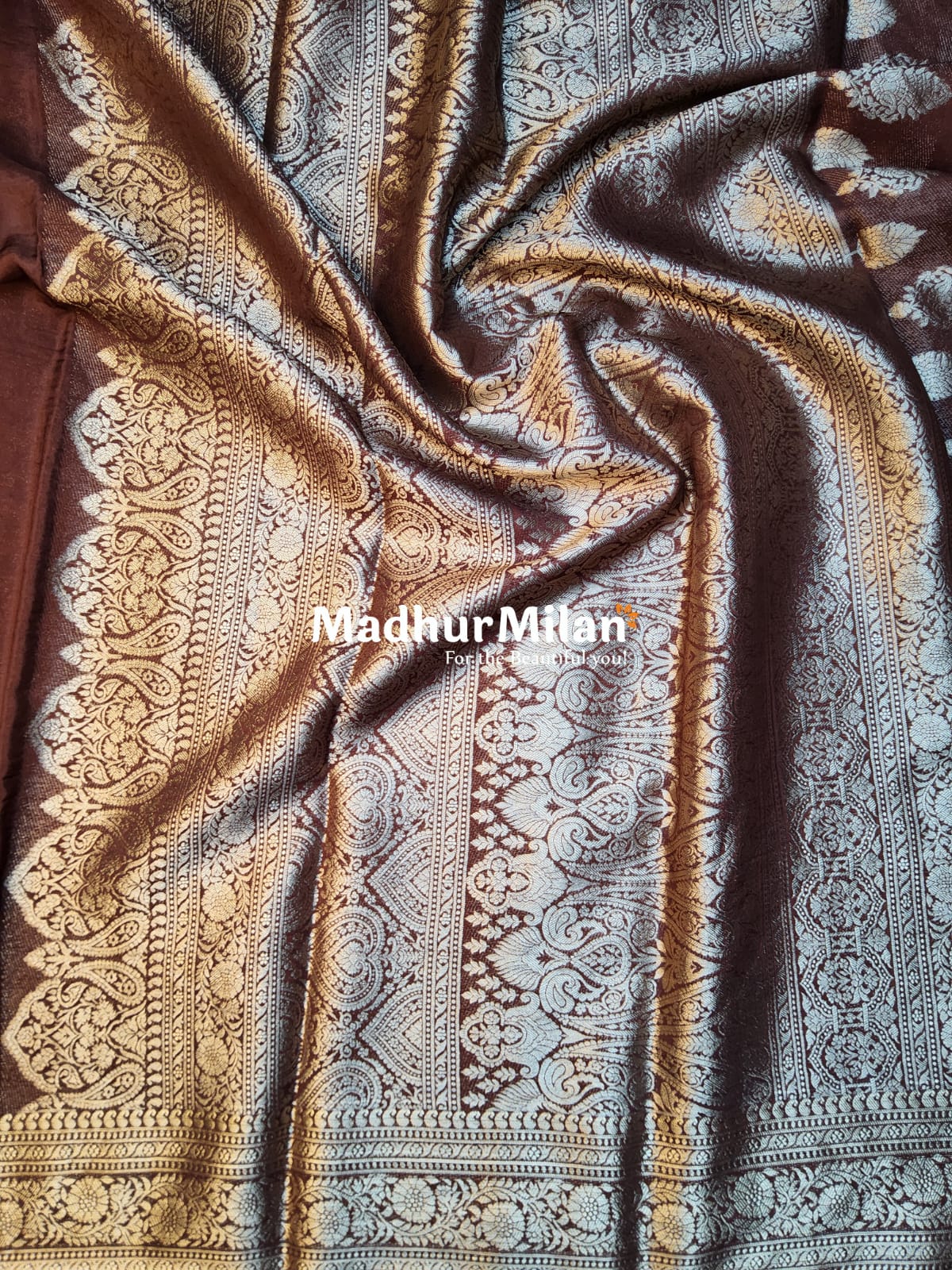 Product Name: MAYA BANARASI CREPE PLAIN BODY GOLD JARI BORDER SAREE COFFEE