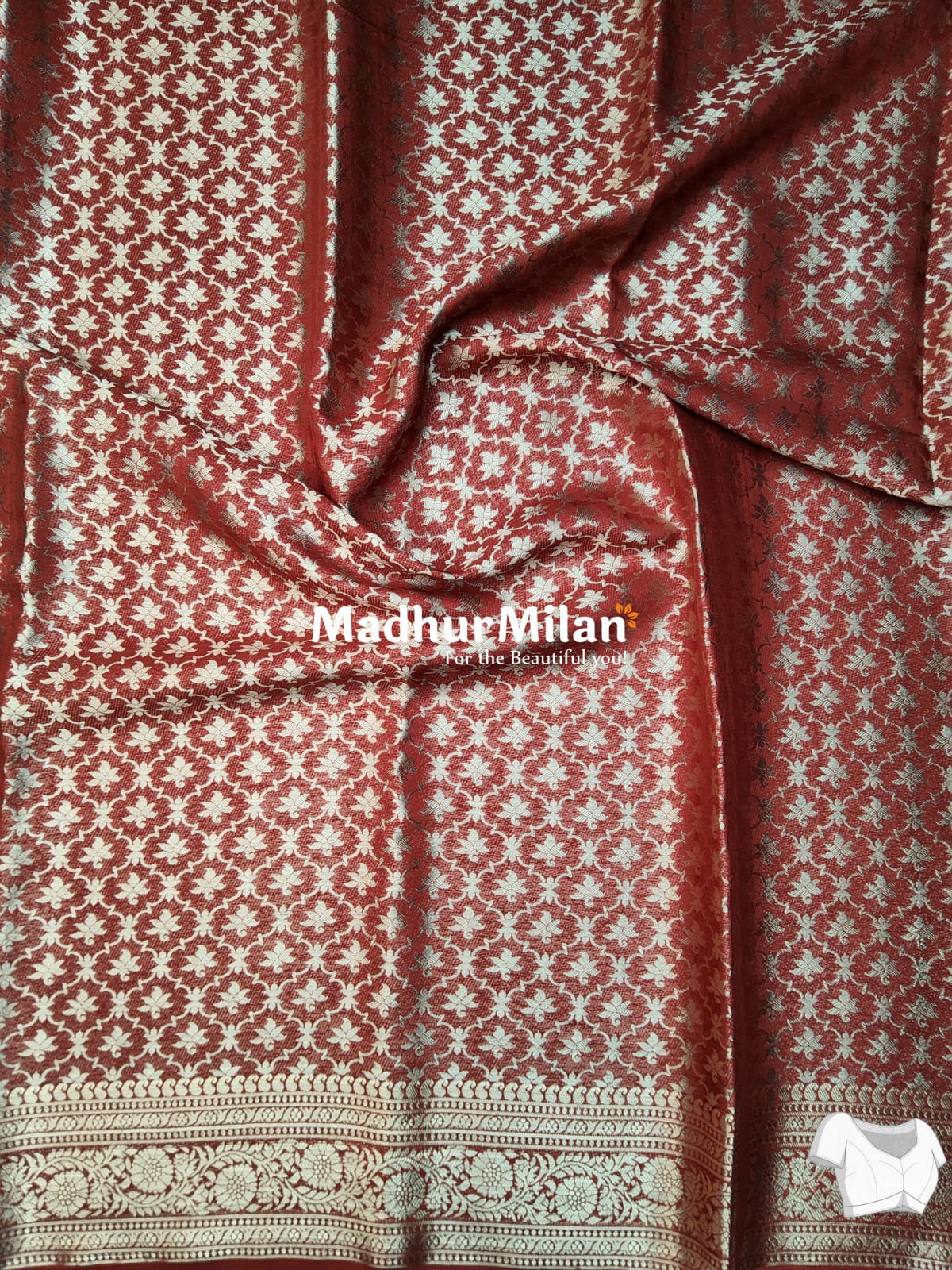 The MAYA Banarasi Crepe Saree is a testament to the artistry of Indian craftsmanship, brought to you by Madhur Milan. It's not just a garment; it's a piece of wearable art that celebrates the beauty of traditional Indian textiles with a modern twist.
