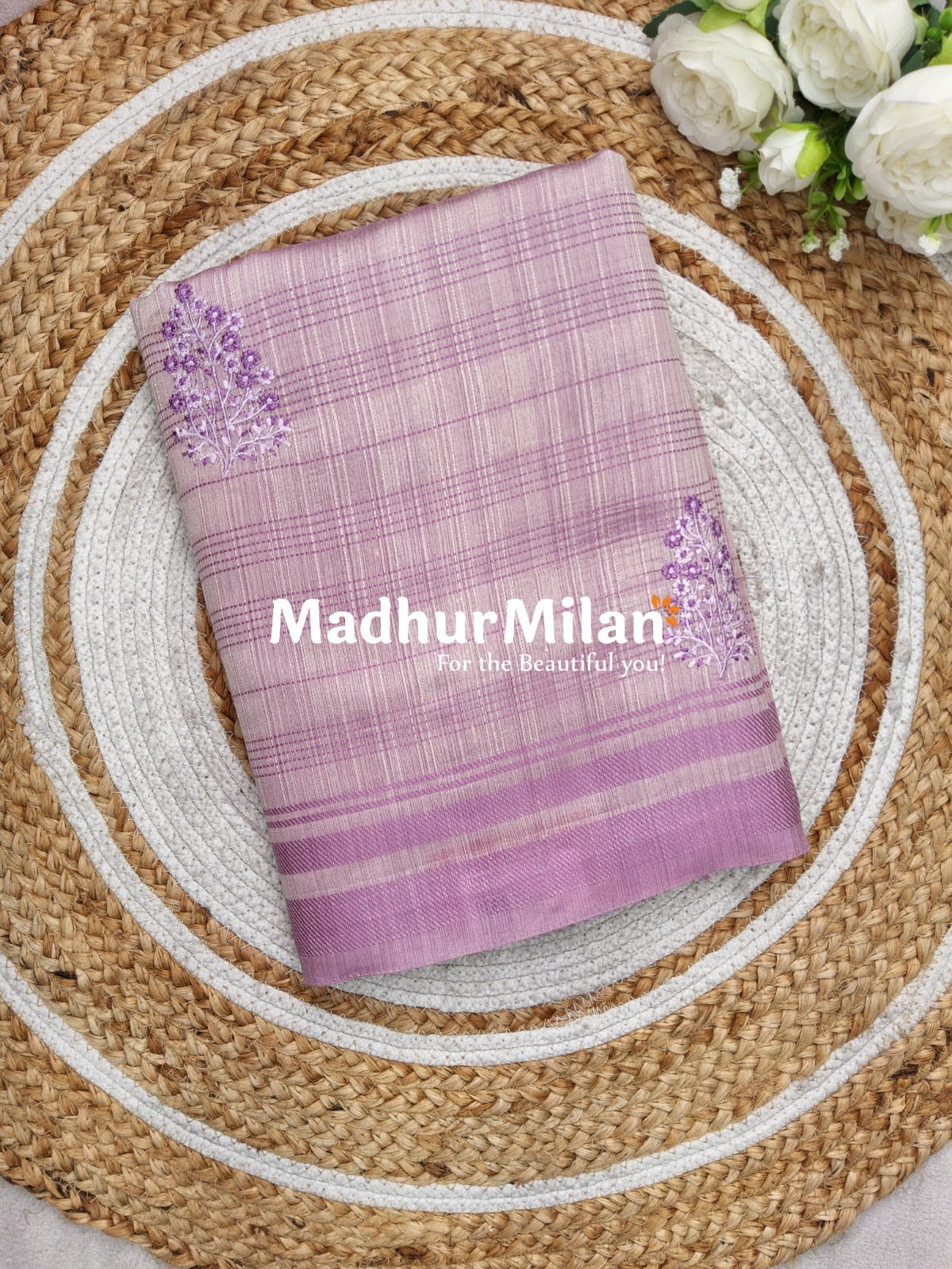 The saree showcases a perfect balance of simplicity and intricacy. The light lavender base is adorned with a subtle checkered pattern, while the exquisite purple embroidered floral motifs add a touch of elegance. The darker lavender border and pallu create a beautiful contrast, enhancing the overall appeal of the saree.