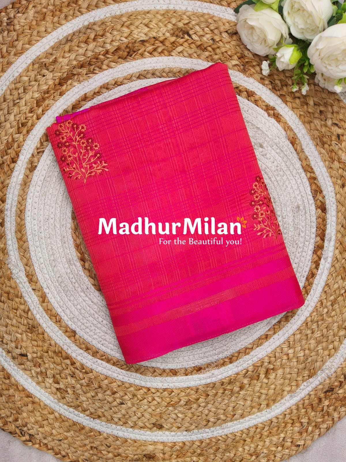 This Madhur Milan saree is perfect for special occasions, festivals, and formal events. The raw silk fabric ensures comfort and a graceful drape, while the embroidered details add a touch of glamour. The vibrant pink color is sure to make you stand out in any crowd.