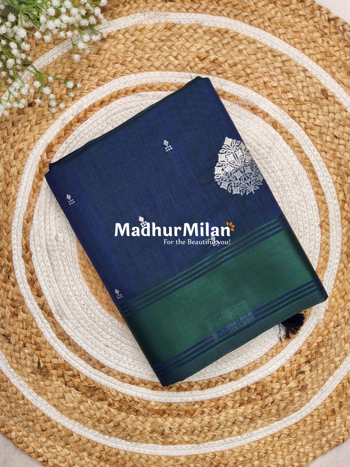 This saree is a perfect choice for both formal occasions and festive celebrations. The raw silk fabric offers a luxurious feel and fall, while the color combination of navy and green exudes elegance and sophistication. The silver motifs add a touch of glamour, making this saree a true head-turner.