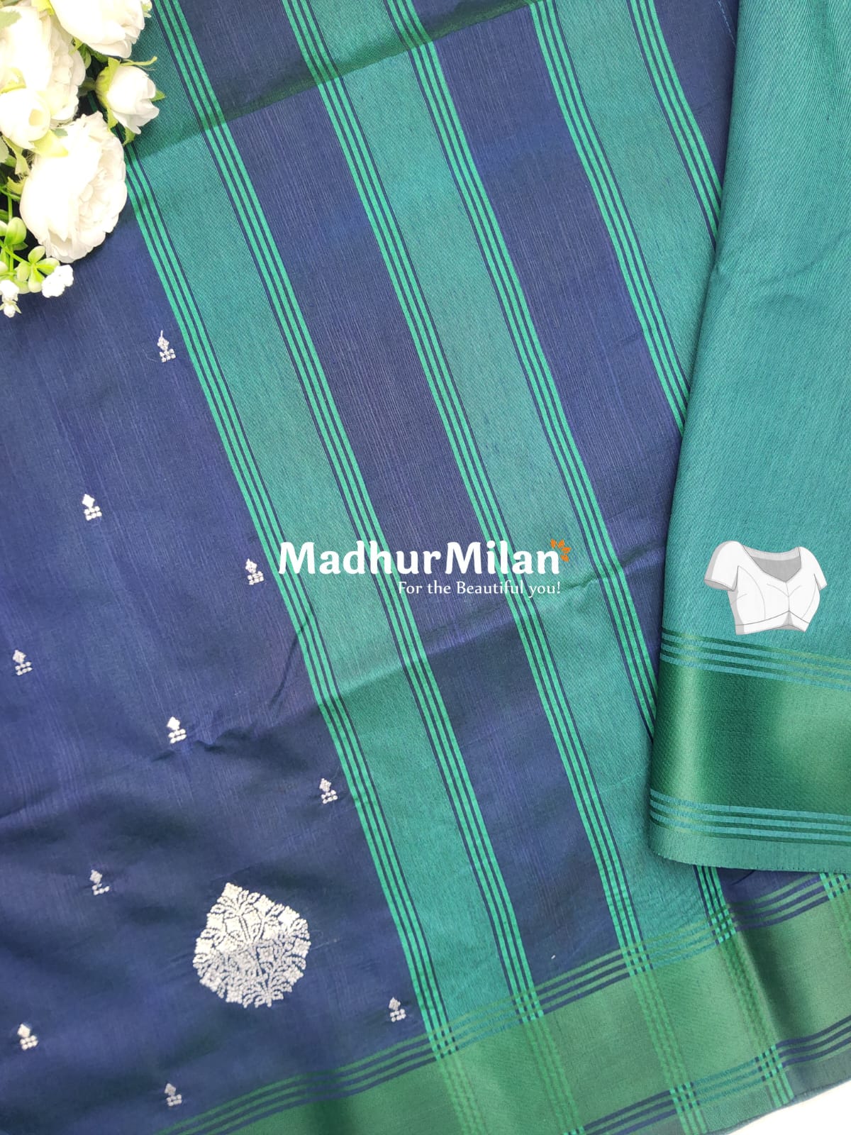 This saree is a perfect choice for both formal occasions and festive celebrations. The raw silk fabric offers a luxurious feel and fall, while the color combination of navy and green exudes elegance and sophistication. The silver motifs add a touch of glamour, making this saree a true head-turner.
