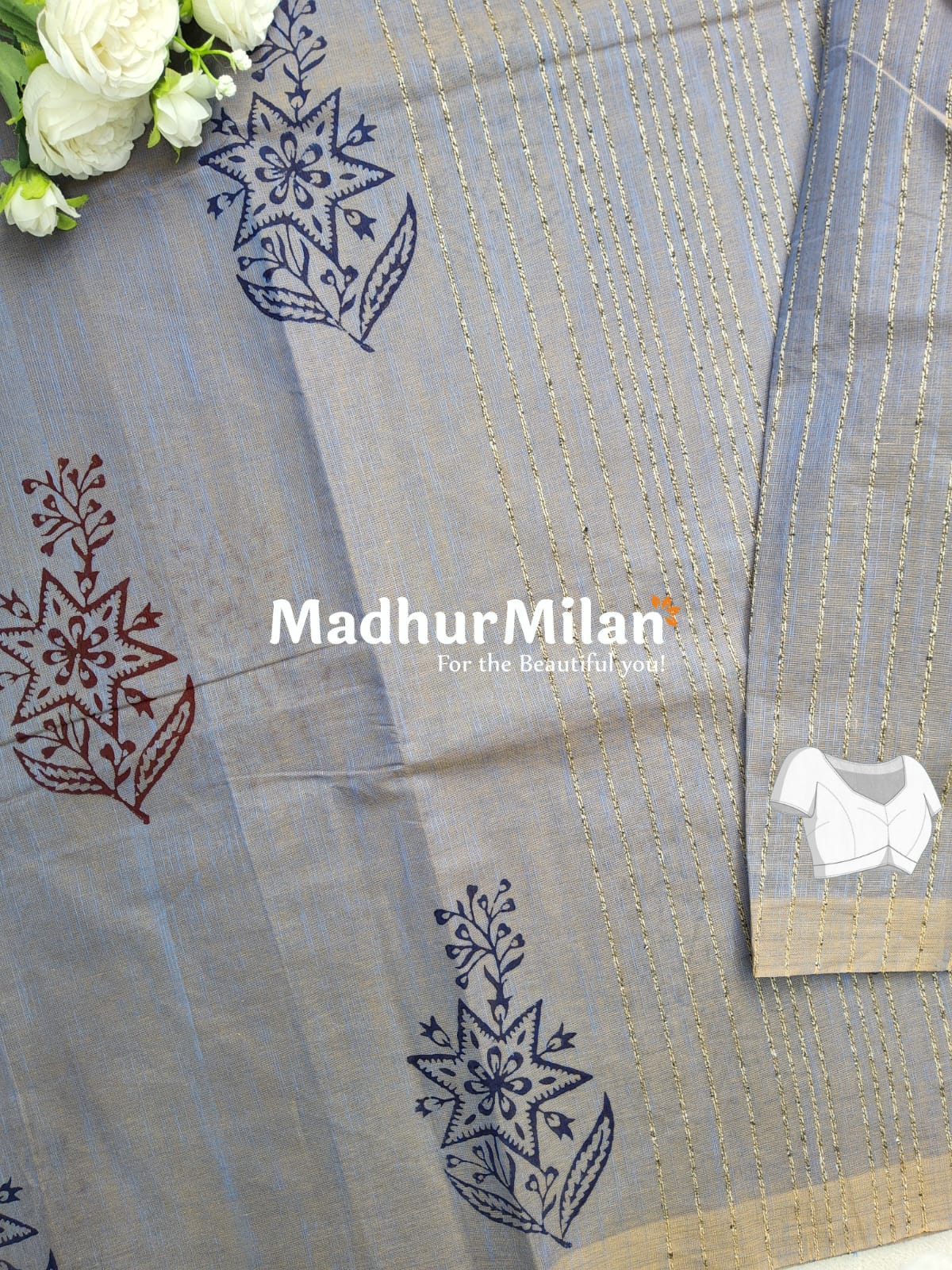 Product Name: HANDPRINT COTTON SAREE GREY BLUE by Madhur Milan