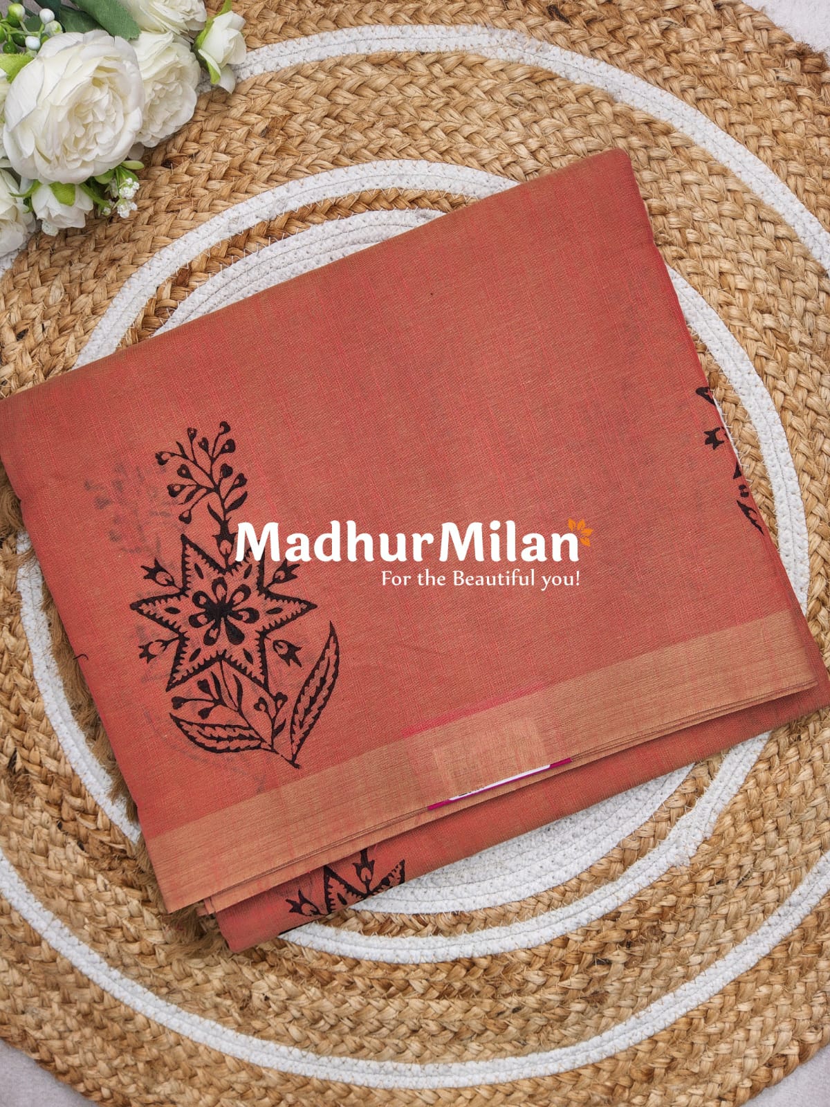 The saree showcases a beautiful terracotta base color, complemented by intricate handprinted designs. The border features a mesmerizing star-shaped floral pattern in black, adding a touch of elegance to the overall look. The body of the saree is embellished with fine silver-toned vertical stripes, creating a subtle shimmer effect.