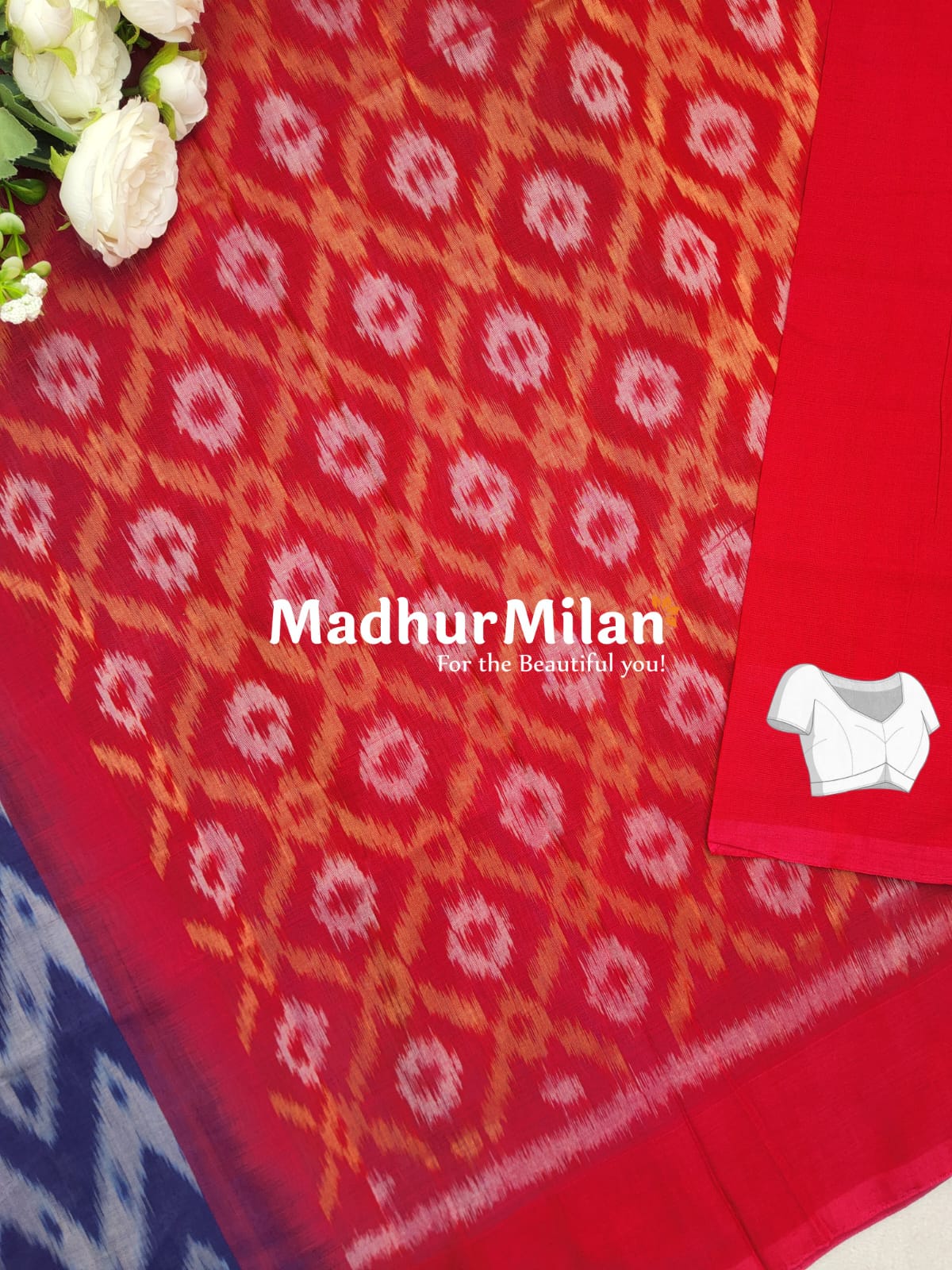 The saree's body showcases a unique zigzag ikat pattern in violet and light gray, while the pallu features a stunning red background with circular ikat motifs in white and orange. This combination of colors and patterns makes for a truly head-turning ensemble.