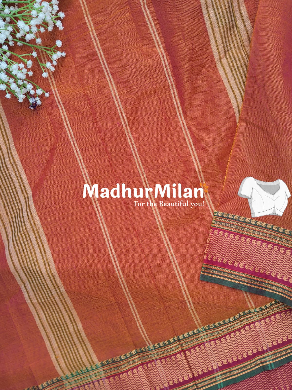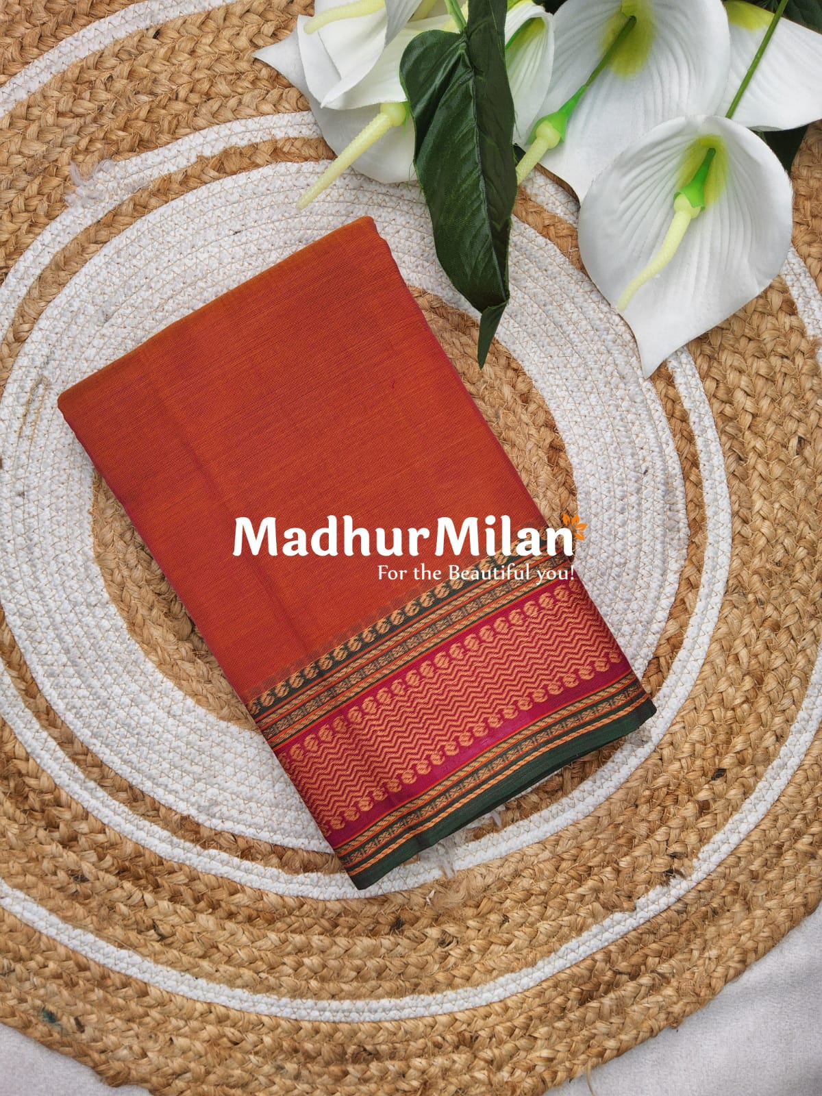 Description: Embrace the rich heritage of South Indian craftsmanship with our exquisite Chettinad Cotton Saree in a stunning orange and green combination. This masterpiece from Madhur Milan is designed "For the Beautiful you!"