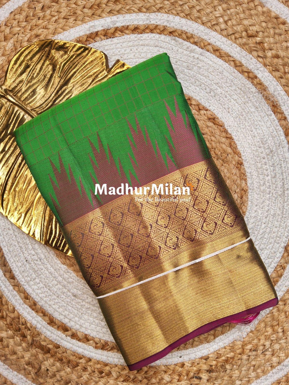 This Madhur Milan saree is a testament to fine craftsmanship and timeless elegance. Its unique color combination and intricate detailing make it a standout piece in any collection. Drape yourself in luxury and tradition with this CHECKS TEMPLE BORDER SAREE JARI BORDER FERN GREEN PURPLE.