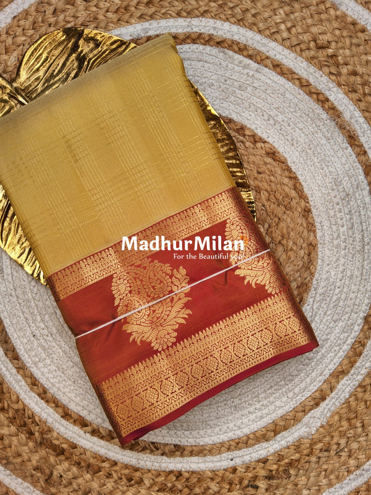 The saree's body showcases a delicate light ivory hue with a subtle 6-line checks pattern, exuding sophistication and grace. The brick-red border and pallu are adorned with intricate golden zari work, featuring traditional motifs and patterns that add a touch of opulence to the overall design. The contrasting colors and textures make this saree a versatile choice for various occasions, from formal events to religious ceremonies. The Bentex silk fabric ensures comfort and ease of draping, while also providing a luxurious feel against the skin. Complete your look with traditional gold jewelry and a matching brick-red blouse to create a stunning ensemble that's sure to turn heads. This Madhur Milan saree is a testament to timeless Indian craftsmanship and is designed to make you feel beautiful and confident.