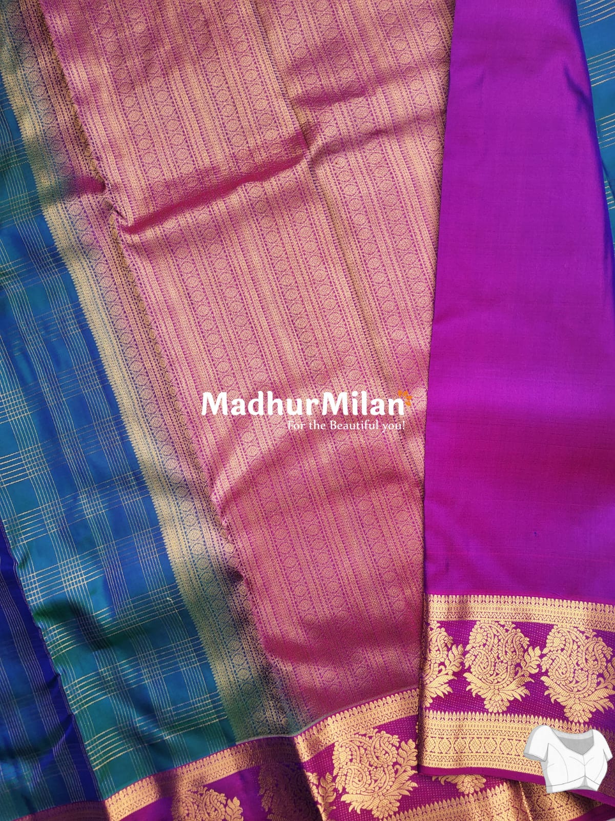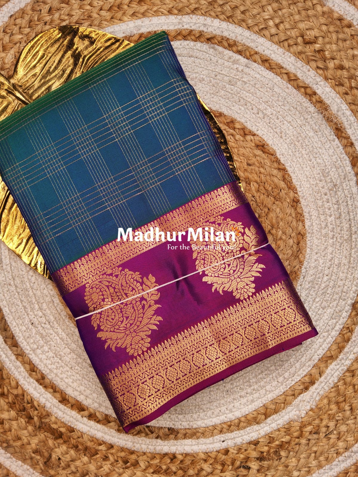 Product Name: BENTEX BIT BUTTA 6 LINE CHECKS SAREE BORDER TEAL BLUE PURPLE by Madhur Milan Description: Elevate your style with this exquisite Madhur Milan saree, designed "For the Beautiful you!" This stunning piece combines traditional craftsmanship with contemporary elegance, perfect for those who appreciate fine Indian textiles.