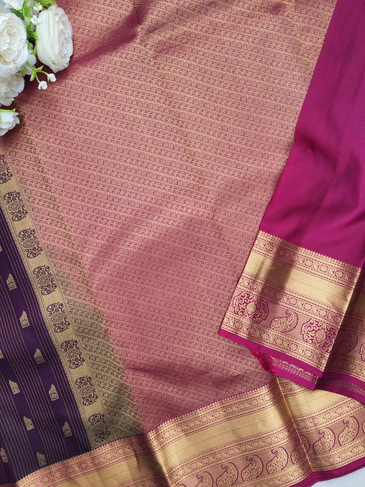 3. Design: - Main body features elegant purple stripes with intricate golden butti motifs - Broad golden border with intricate paisley and floral designs - Pallu showcases a beautiful combination of wine pink and gold with elaborate patterns