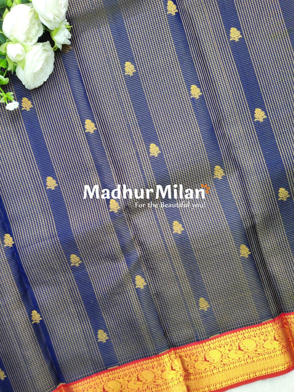 Pattern & Texture: - The body of the saree features a navy-blue base with golden check patterns - Delicate golden butta motifs are evenly distributed throughout the fabric - The red border is adorned with intricate golden zari work, depicting traditional designs Versatility.