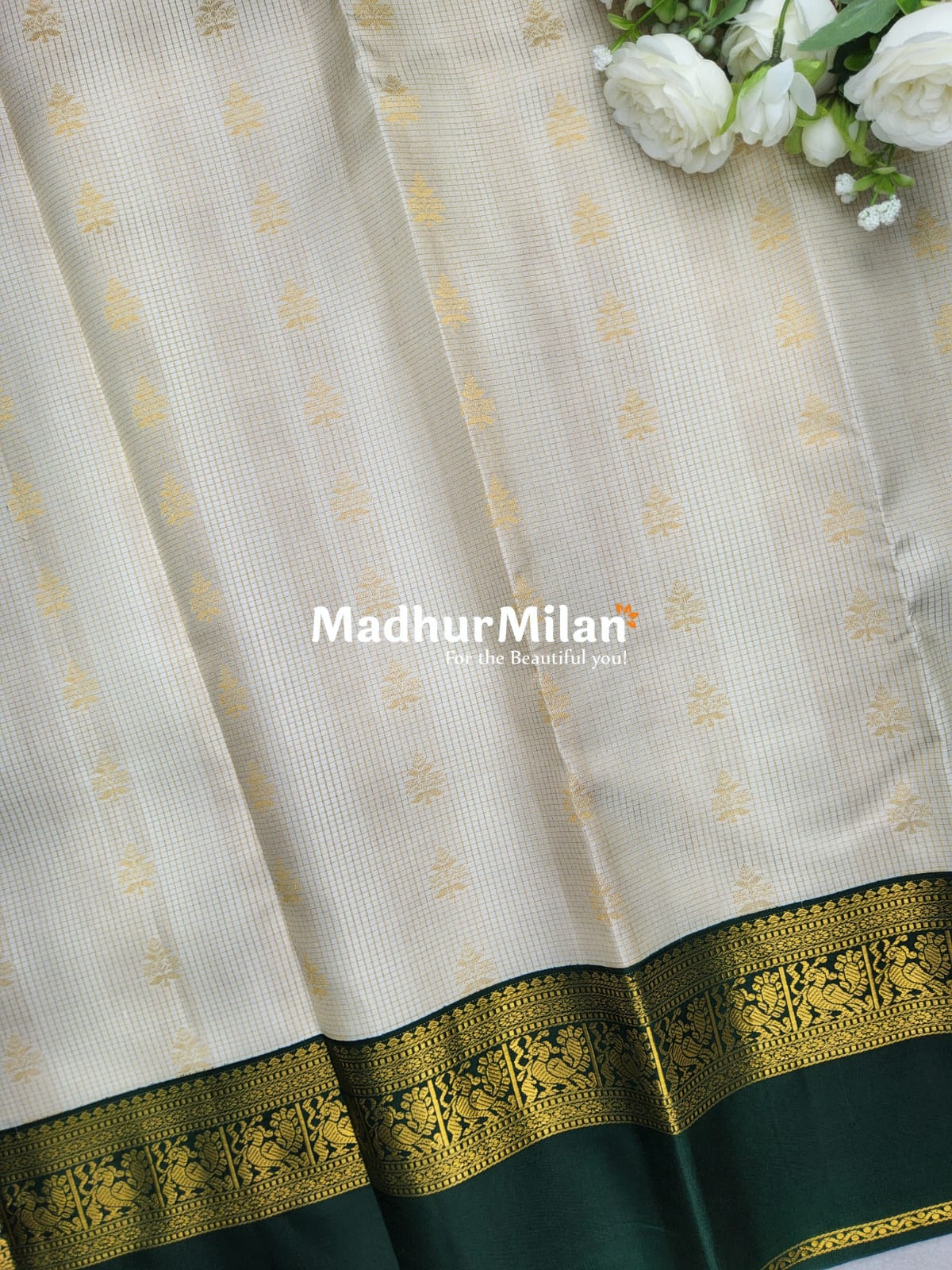 Elements: - The cream body is adorned with small, golden woven checks, adding a touch of shimmer - A broad, contrasting green border with ornate golden zari work runs along the edges - The pallu showcases an exquisite golden pattern, depicting traditional symbols and designs - The green border features a double layer of golden patterns, enhancing its royal appearance Styling.