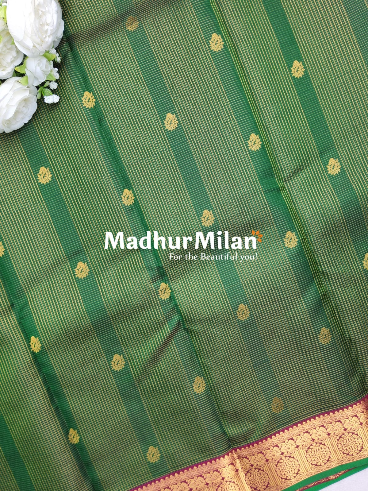 1. Rich Color Palette: The saree boasts a beautiful green body adorned with intricate golden checks and butta motifs, complemented by a luxurious maroon border. .