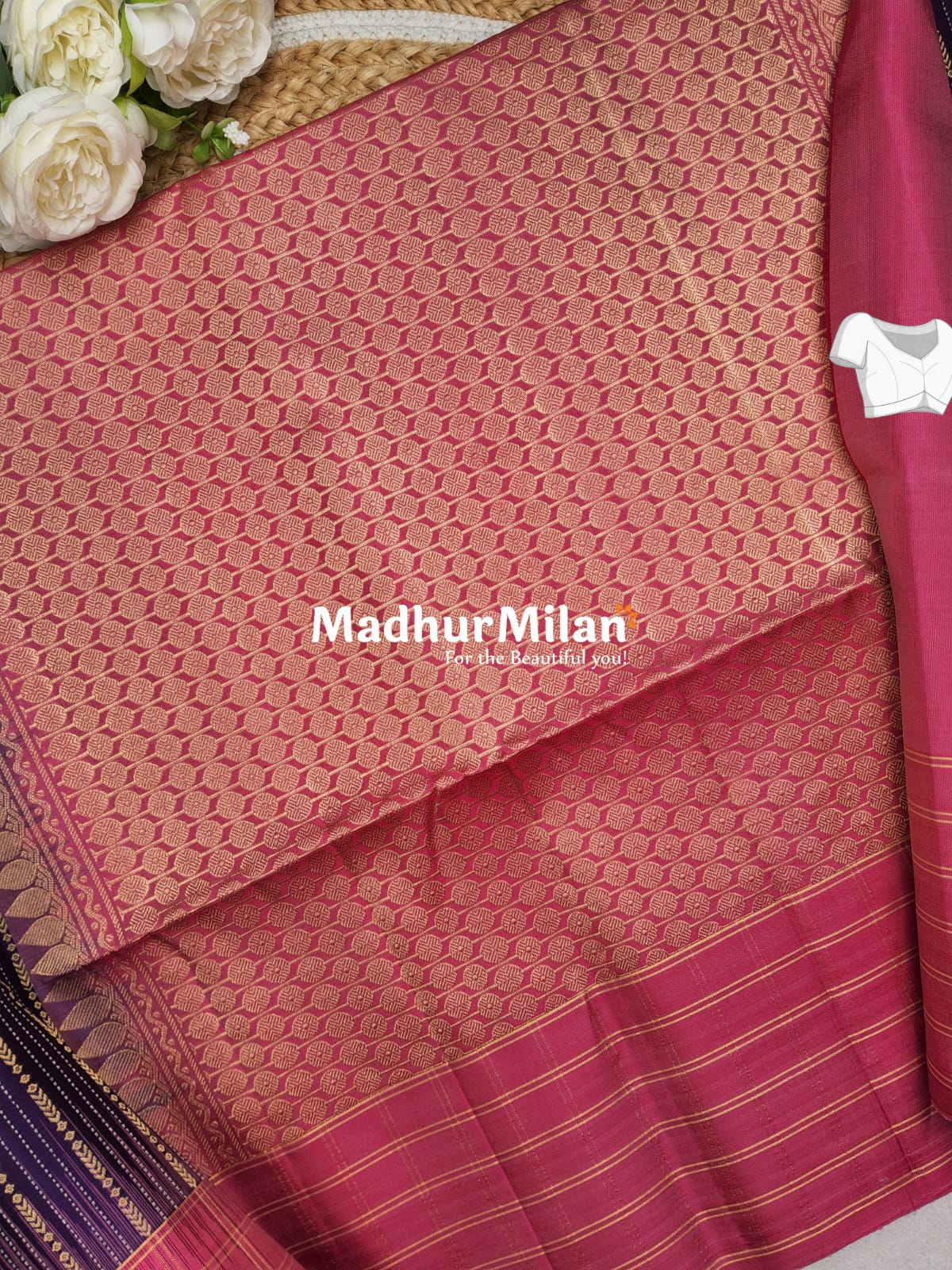 2. Colors: Rich violet body with contrasting light pink border and pallu.
