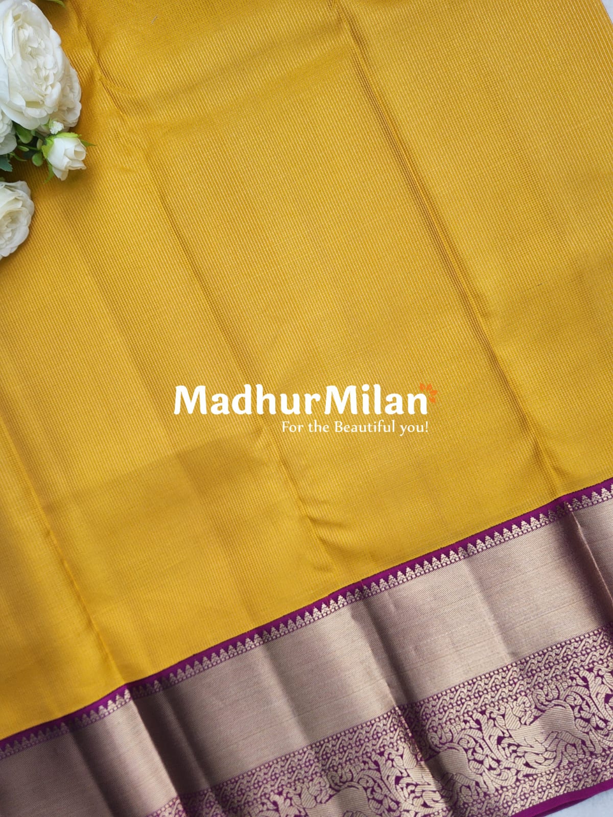The saree showcases a harmonious blend of colors - the radiant golden yellow body perfectly complemented by the deep wine border and pallu. The micro checks on the body add a subtle texture, while the ornate zari work on the border and pallu elevates the saree's grandeur. Ideal for festivals, weddings, and special occasions,