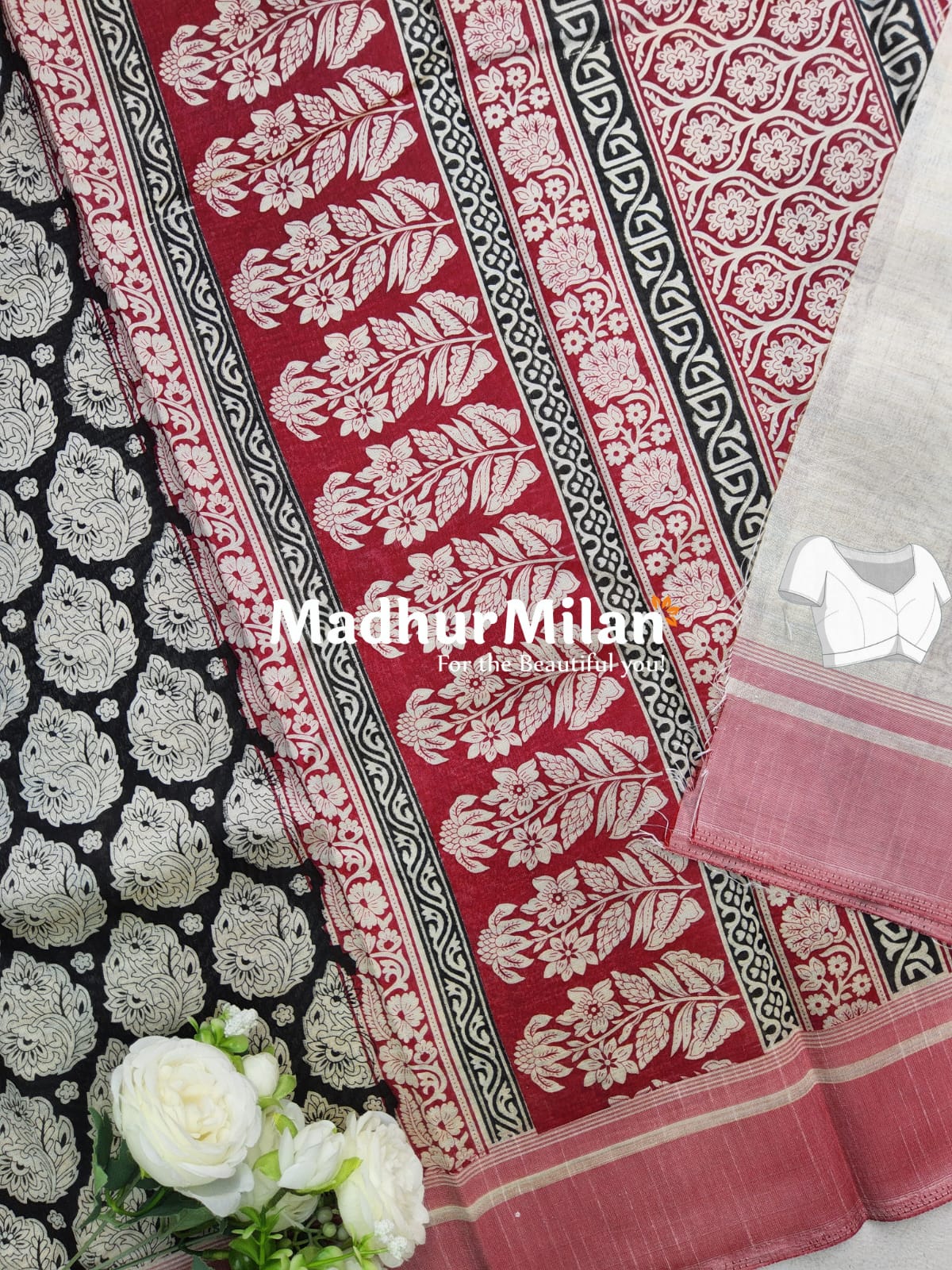 This CHARCOAL BEAUTY SAREE RED BLACK is a testament to the rich heritage of Indian textiles, combining timeless patterns with contemporary color combinations. The contrasting red border and pallu against the charcoal black body create a striking visual impact, ensuring you stand out in any crowd. The included blouse piece complements the saree beautifully, offering versatility in styling.