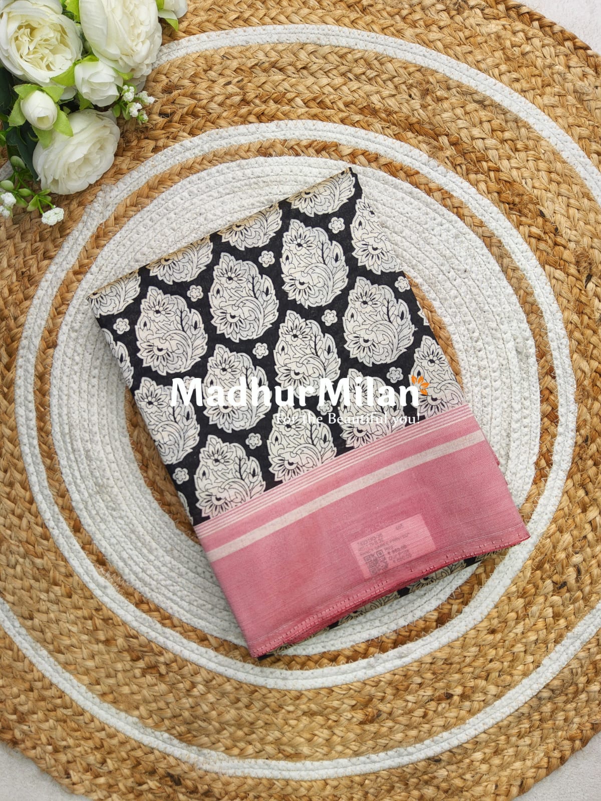 4. Versatility: Suitable for weddings, festivals, formal events, and special occasions Pattern Details: - The body features large, elegant white paisley designs on a charcoal black background - The border showcases a stunning red base with intricate white floral patterns and leaf motifs - Geometric black patterns add a modern touch to the traditional design