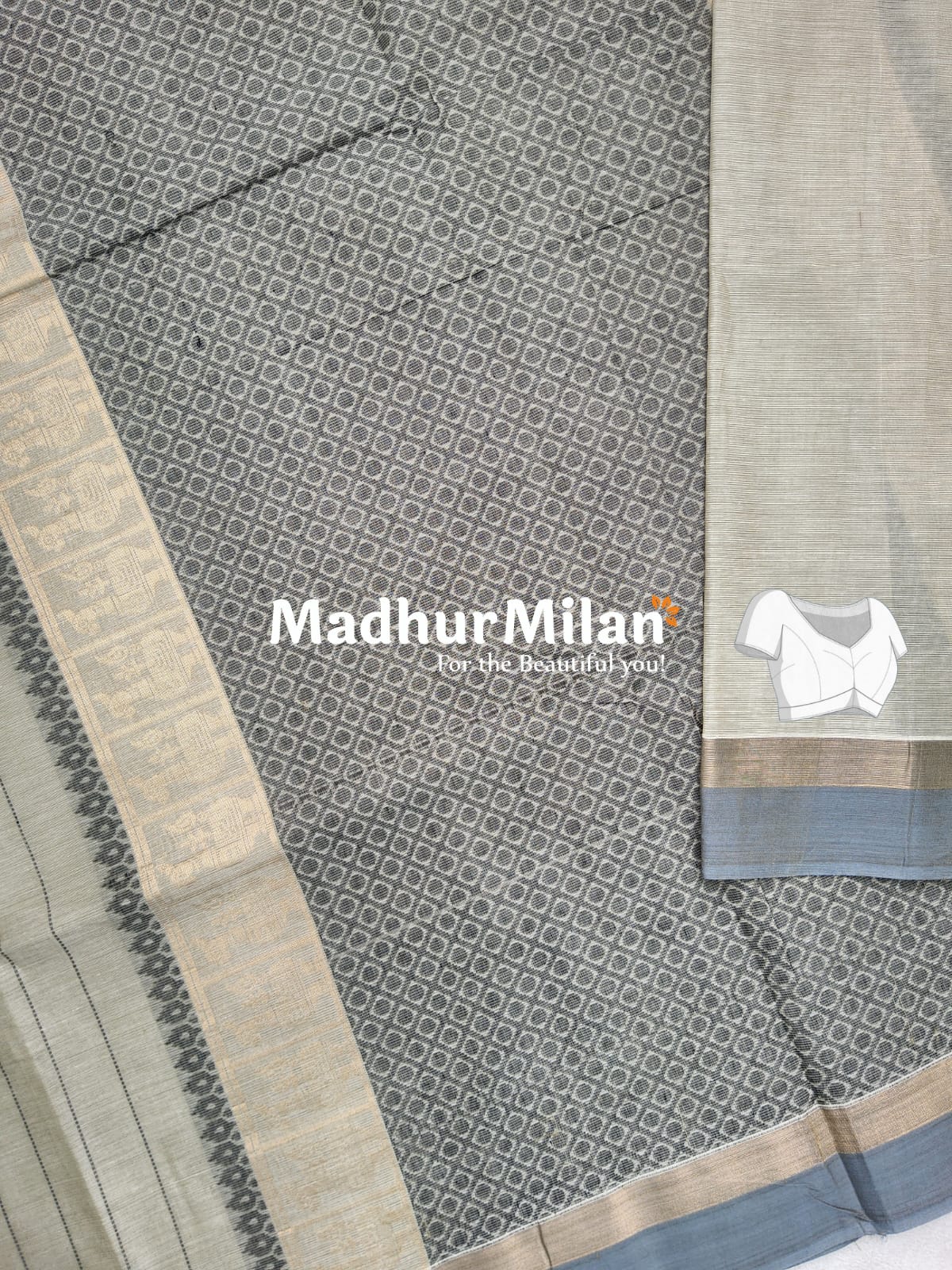 Madhur Milan's commitment to quality is evident in every thread of this saree. The brand's signature elephant logo subtly embossed on the fabric speaks to the authenticity and heritage of the product. Whether you're attending a family gathering, a festival celebration, or a workplace event, this saree will make you stand out with its understated elegance and timeless appeal.