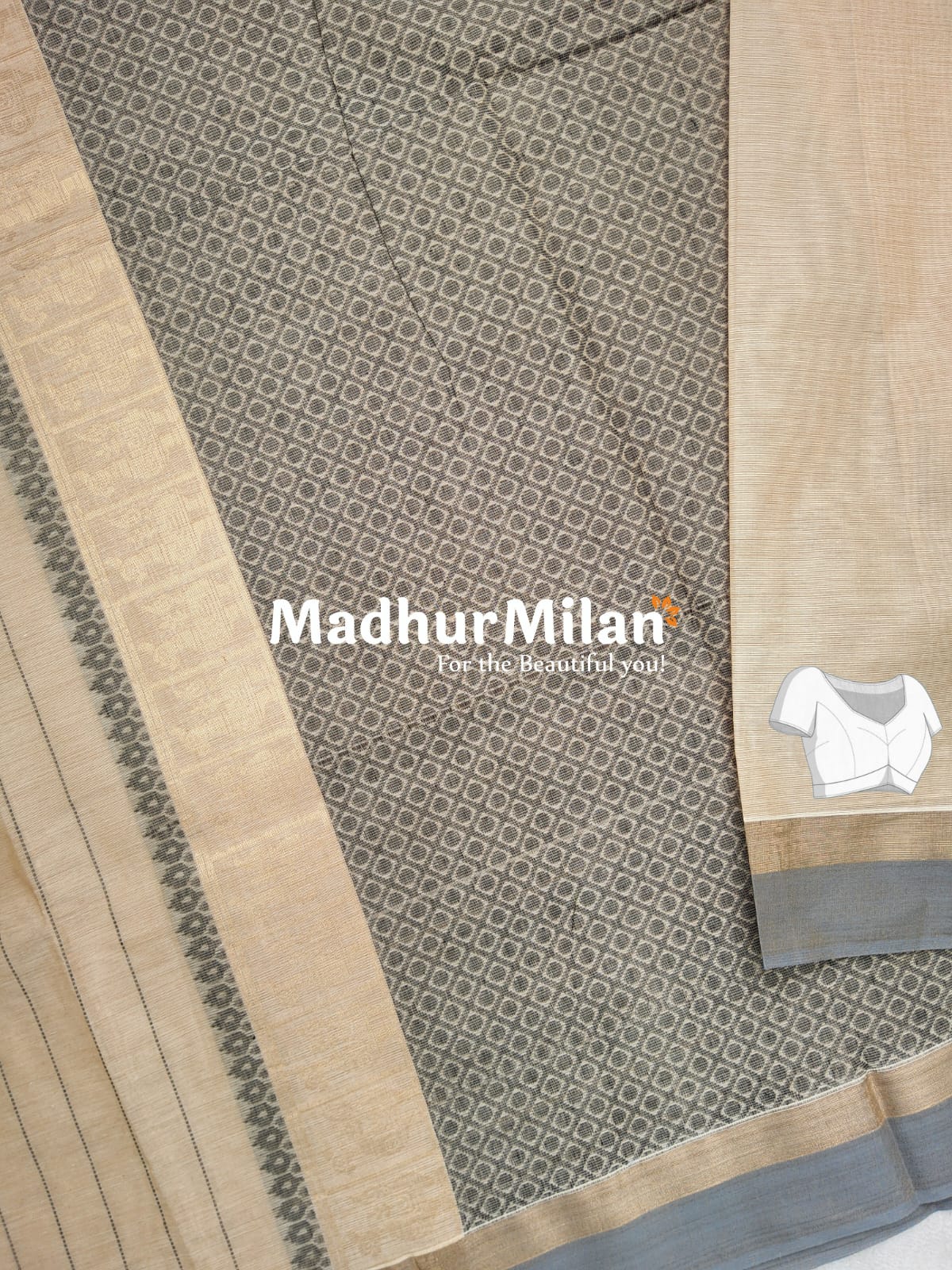 Blouse Piece: Includes a matching blouse piece for a complete ensemble The saree's body showcases a mesmerizing diamond pattern in gray and beige, creating a subtle yet eye-catching effect. The wide beige border with its pinstripes offers a perfect contrast, while the pallu stands out with its distinctive folk art-inspired design.