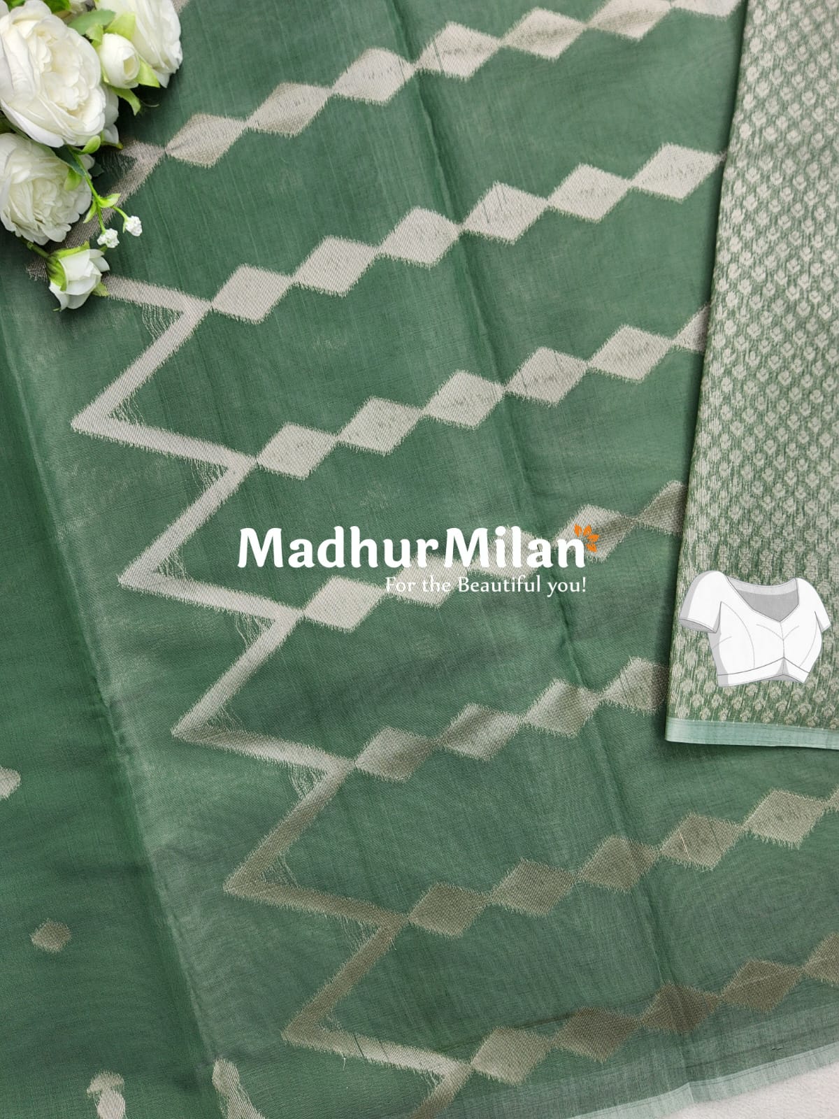 Description: Elevate your ethnic wardrobe with the exquisite KOVAI ZIG ZAG BORDER SILK COTTON SAREE in a captivating dusty green shade.