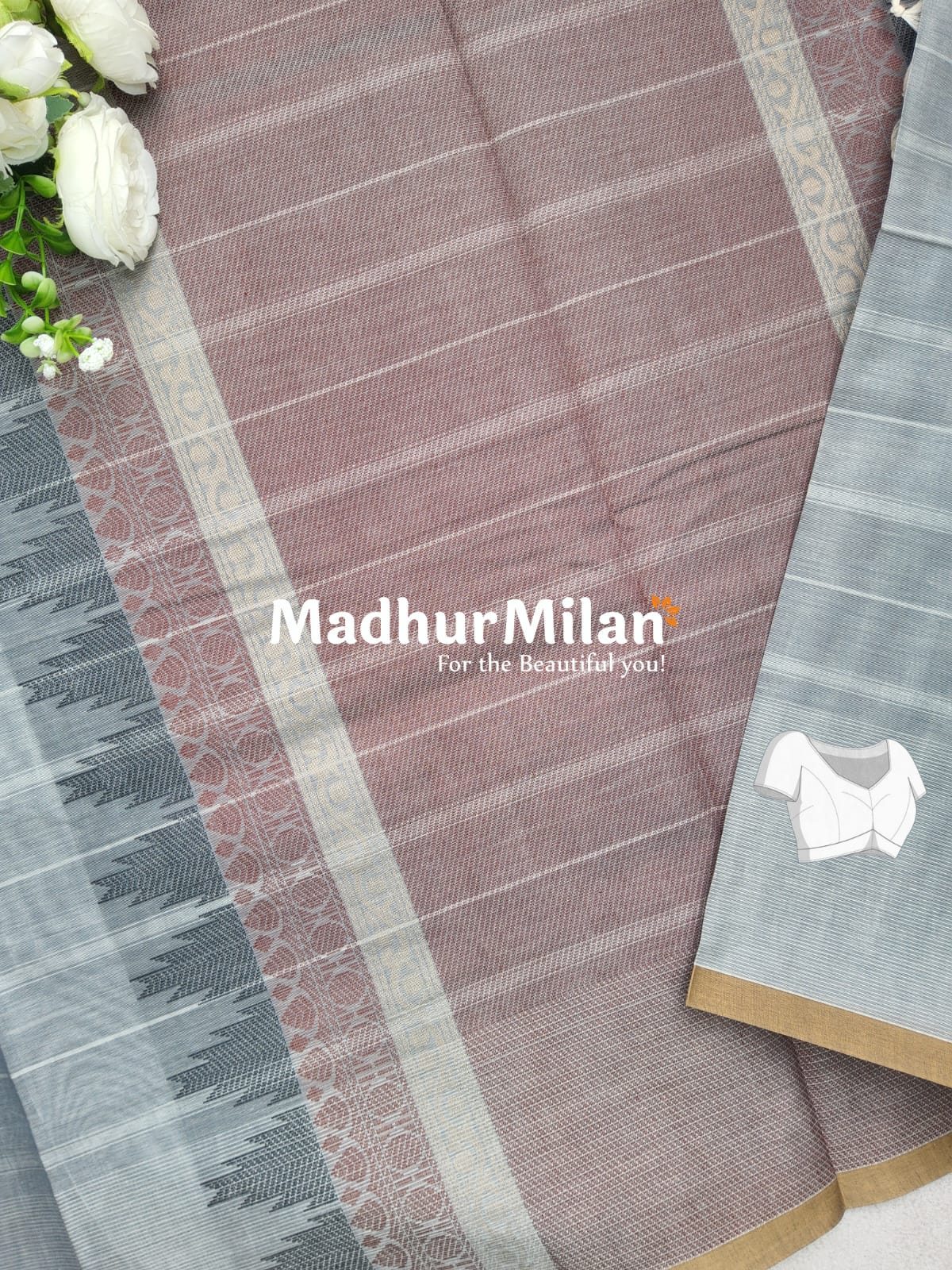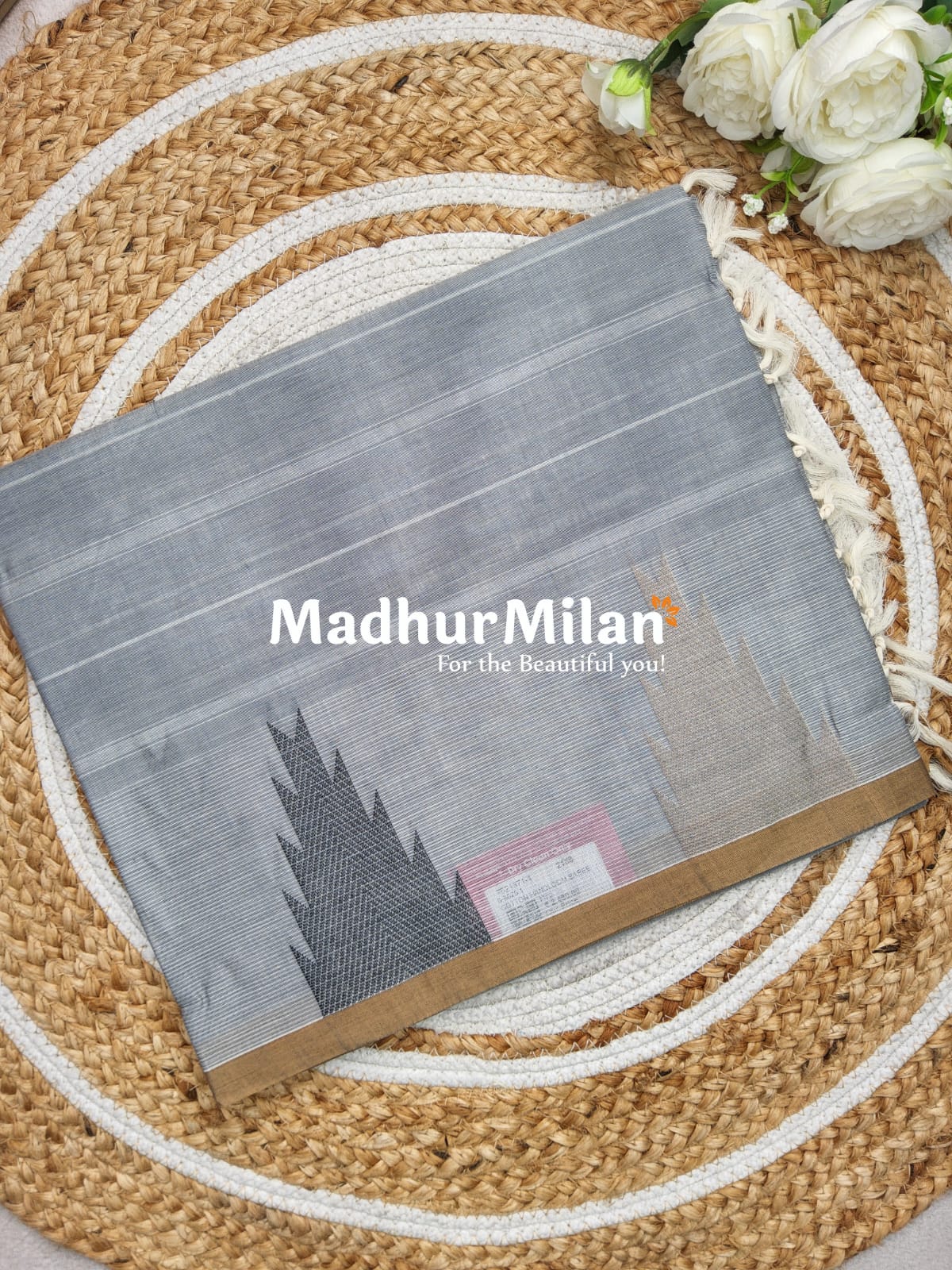 Description: Elevate your ethnic wardrobe with the exquisite SUTI TEMPLE BUTTA BORDER COTTON SAREE in a sophisticated grey hue.