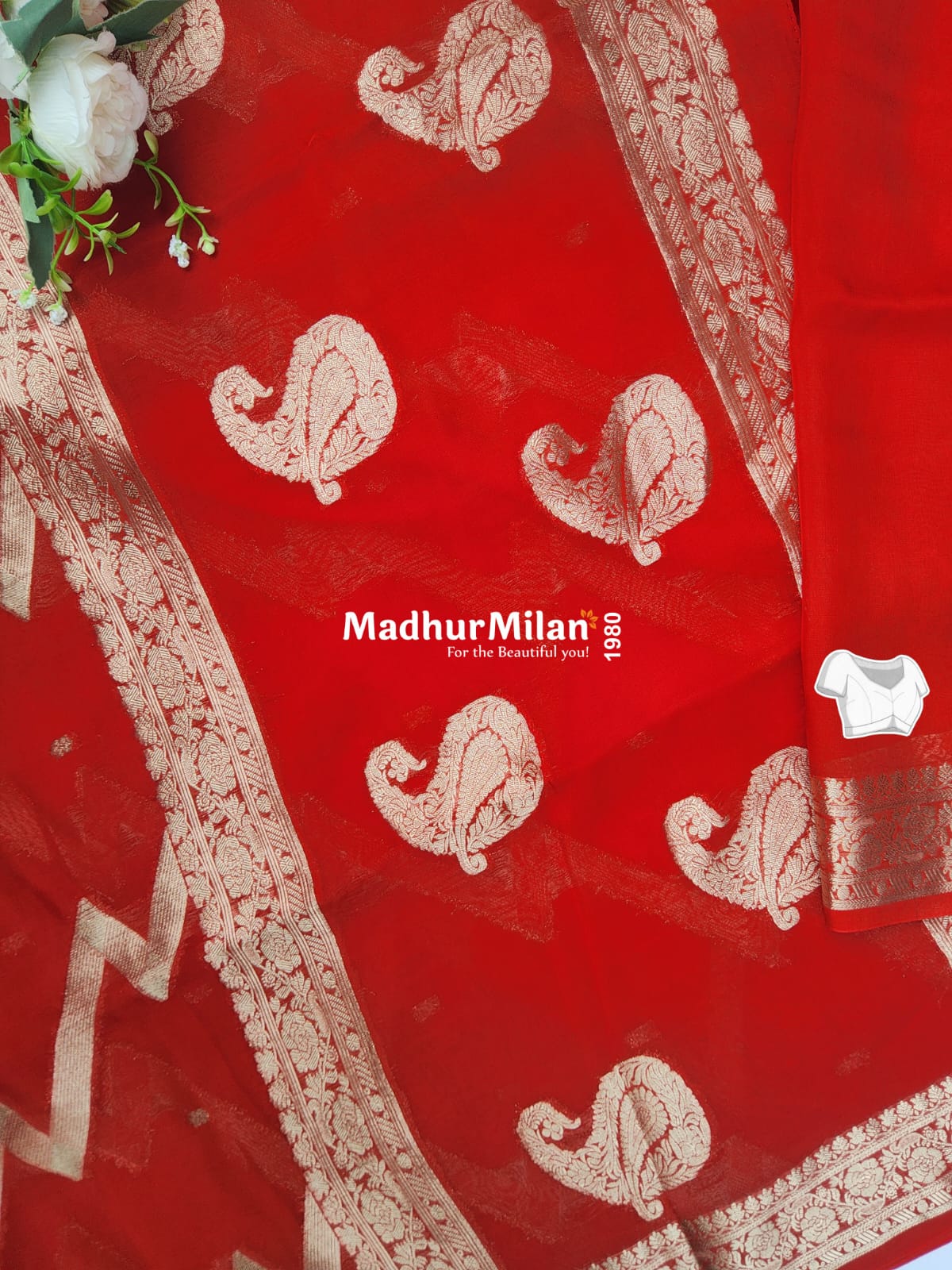 Product Name: BANARASI ZIG ZAG RUSSIAN CREPE SAREE RED
