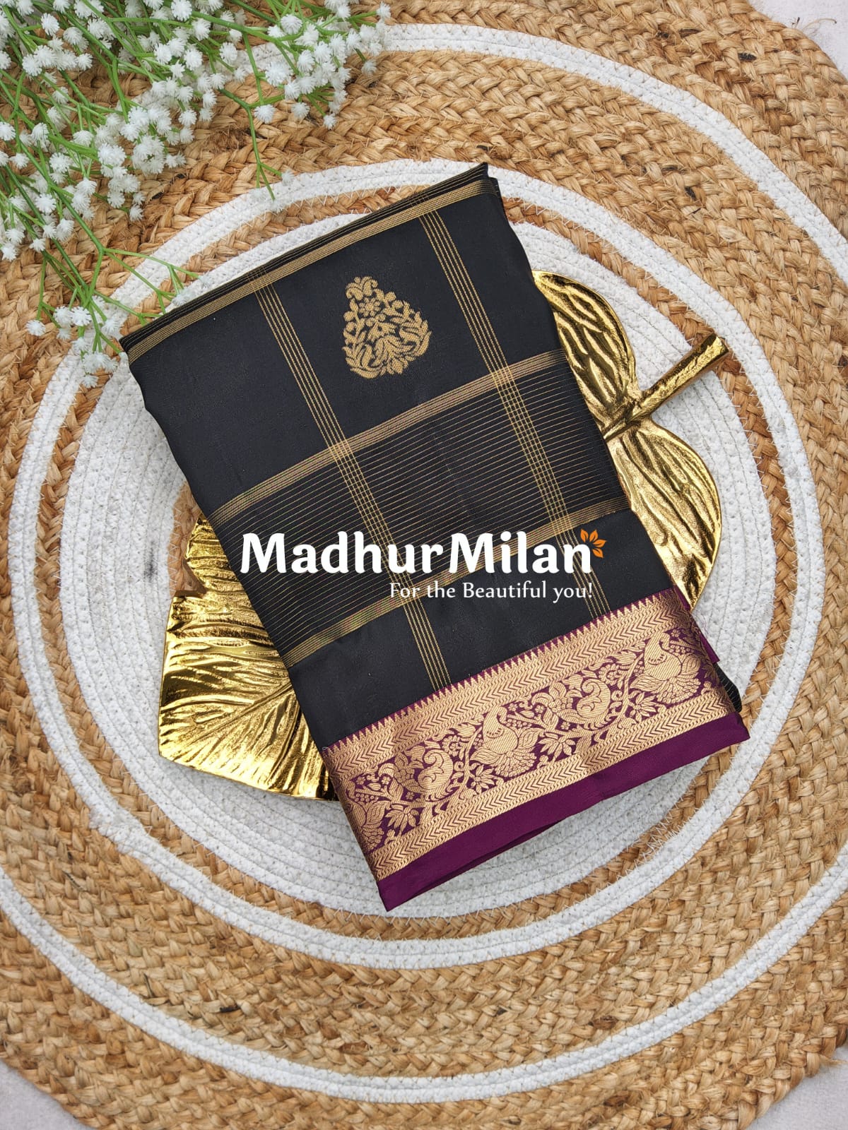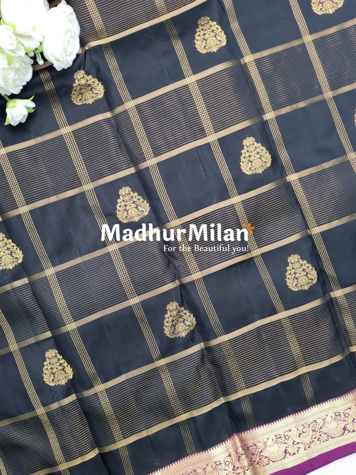 1. Luxurious Color Combination: The saree features a rich black body adorned with golden checks and buttas, complemented by a striking wine-colored border and pallu.