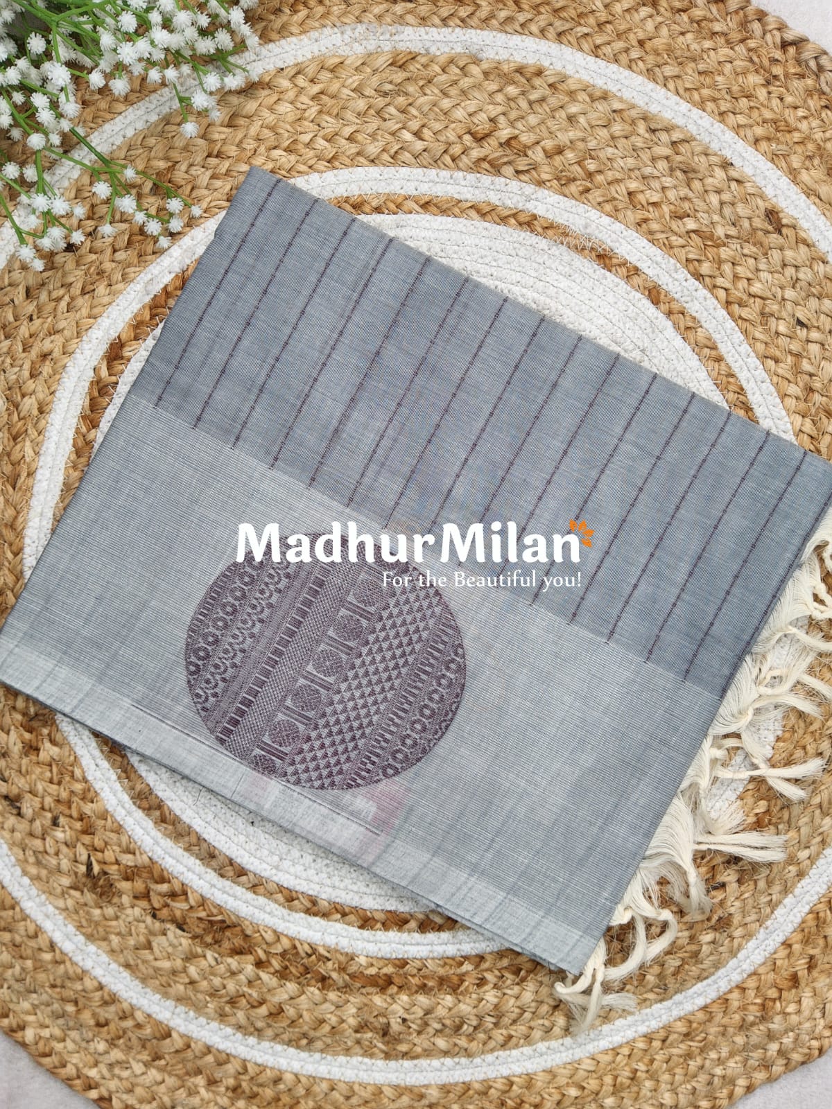 Drape yourself in the beauty of Indian craftsmanship - order your SUTI STRIPED BUTTA BORDER WEAVING COTTON SAREE GREY today and experience the magic of Madhur Milan!