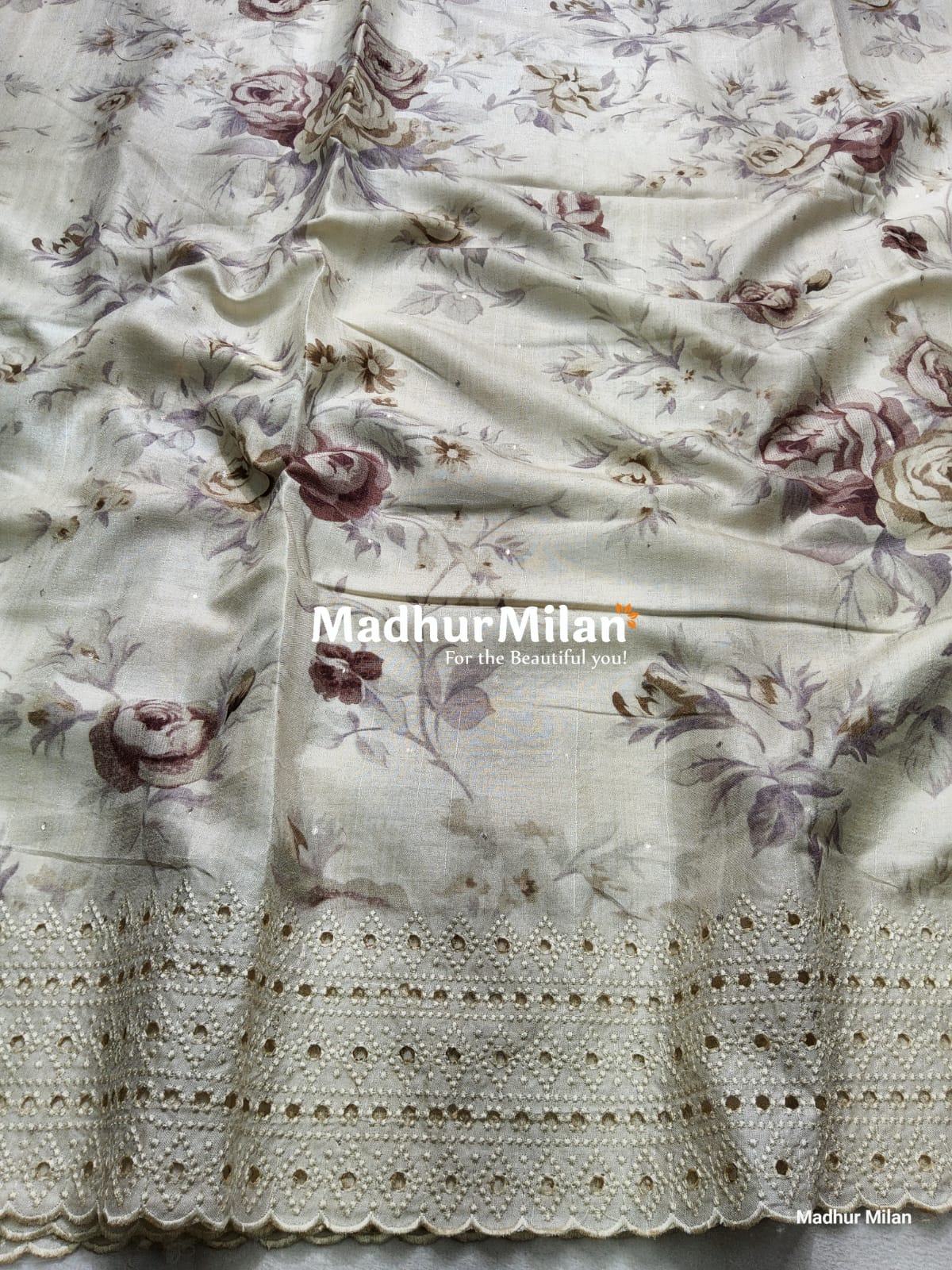 Product Description: Introducing the SEMI TUSSER FLORAL PRINTED BORDER EMBROIDERY SAREE in DUSTY BROWN from Madhur Milan - a perfect blend of elegance and tradition.