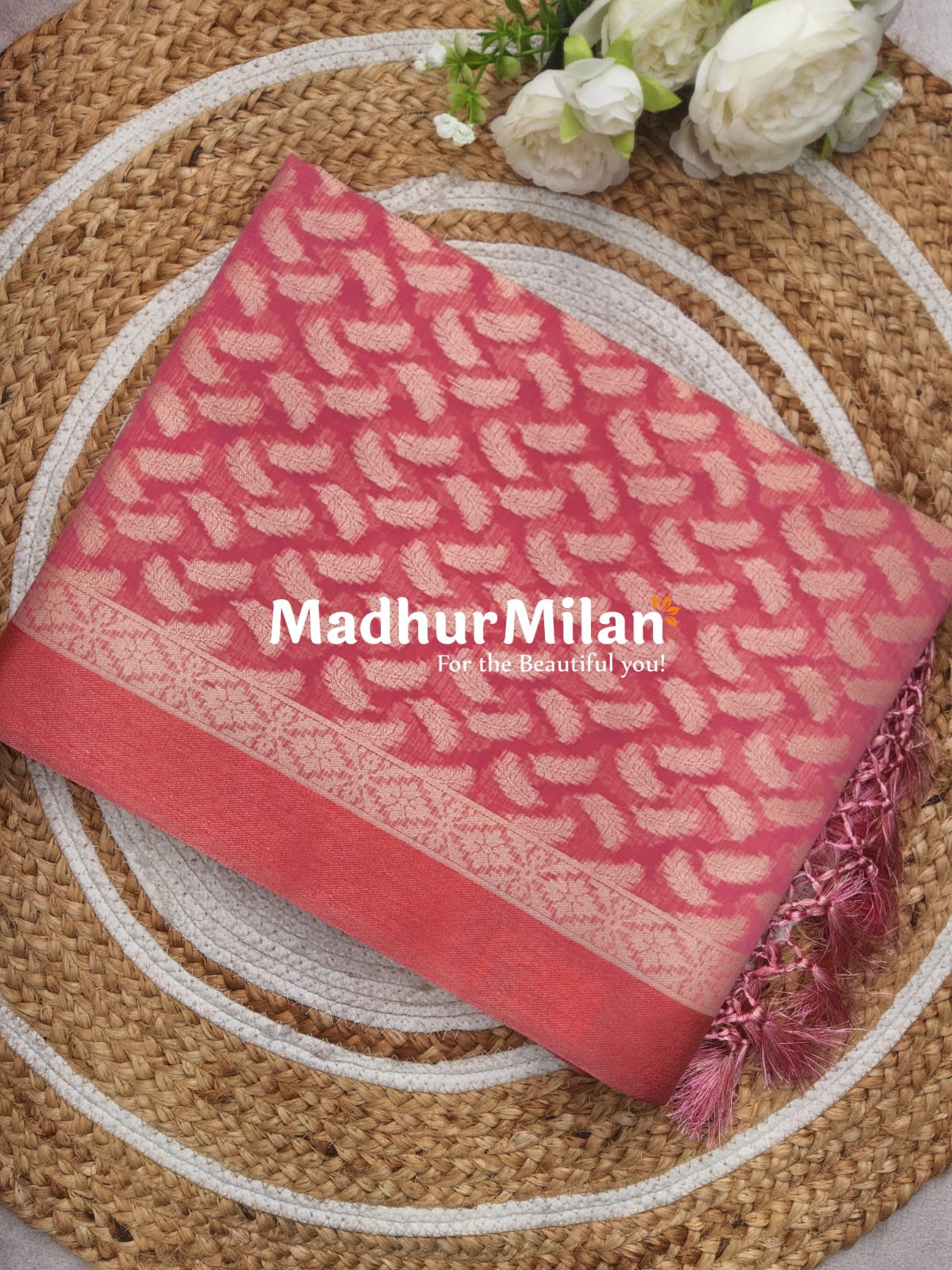 Description: Elevate your ethnic wardrobe with this exquisite Swiss Cotton Saree in a captivating pink hue from Madhur Milan. This saree is a perfect blend of traditional craftsmanship and contemporary style, designed to make you feel beautiful and confident.
