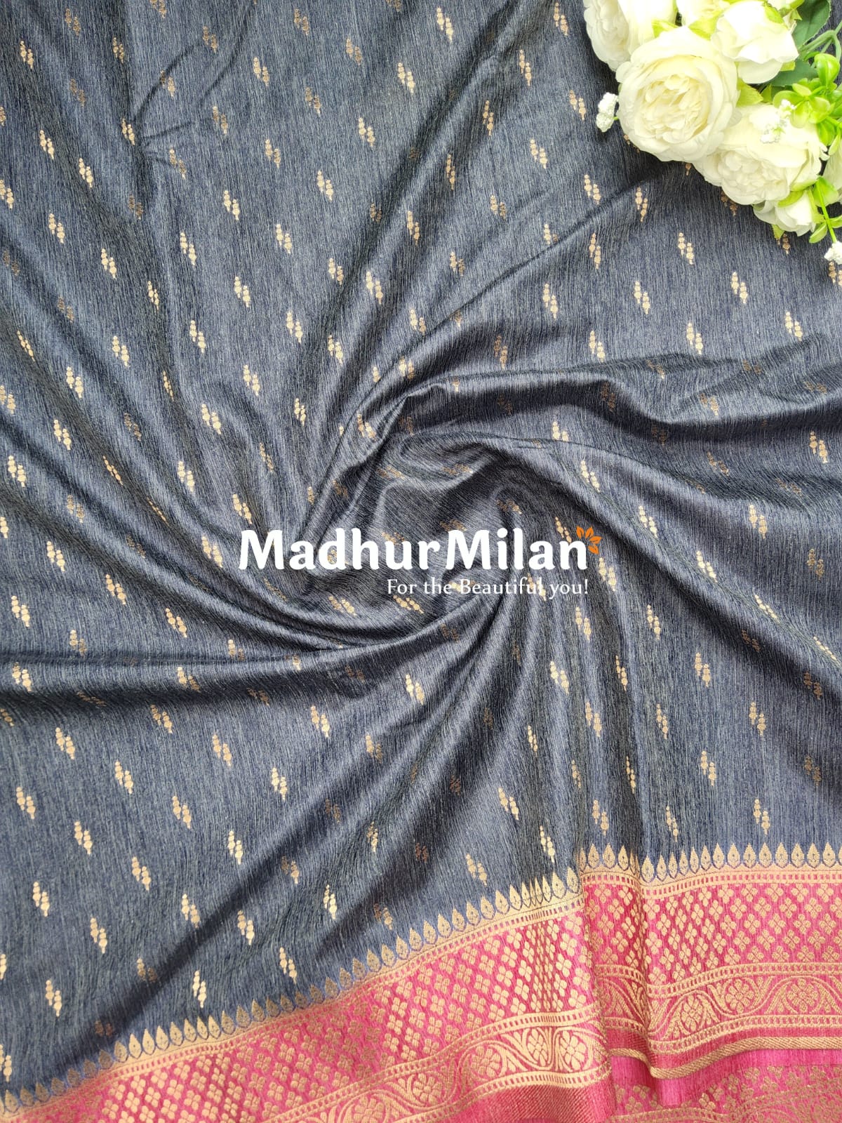 Product Details: - The main body showcases a dusty grey hue with delicate golden butis (small patterns) spread evenly - The border and pallu feature a rich pink color with intricate golden zari work - Traditional Banarasi patterns include floral designs, paisley motifs, and geometric shapes - Suitable for various occasions, from formal events to festive celebrations - Versatile enough to be styled as a saree or used to create fusion outfits