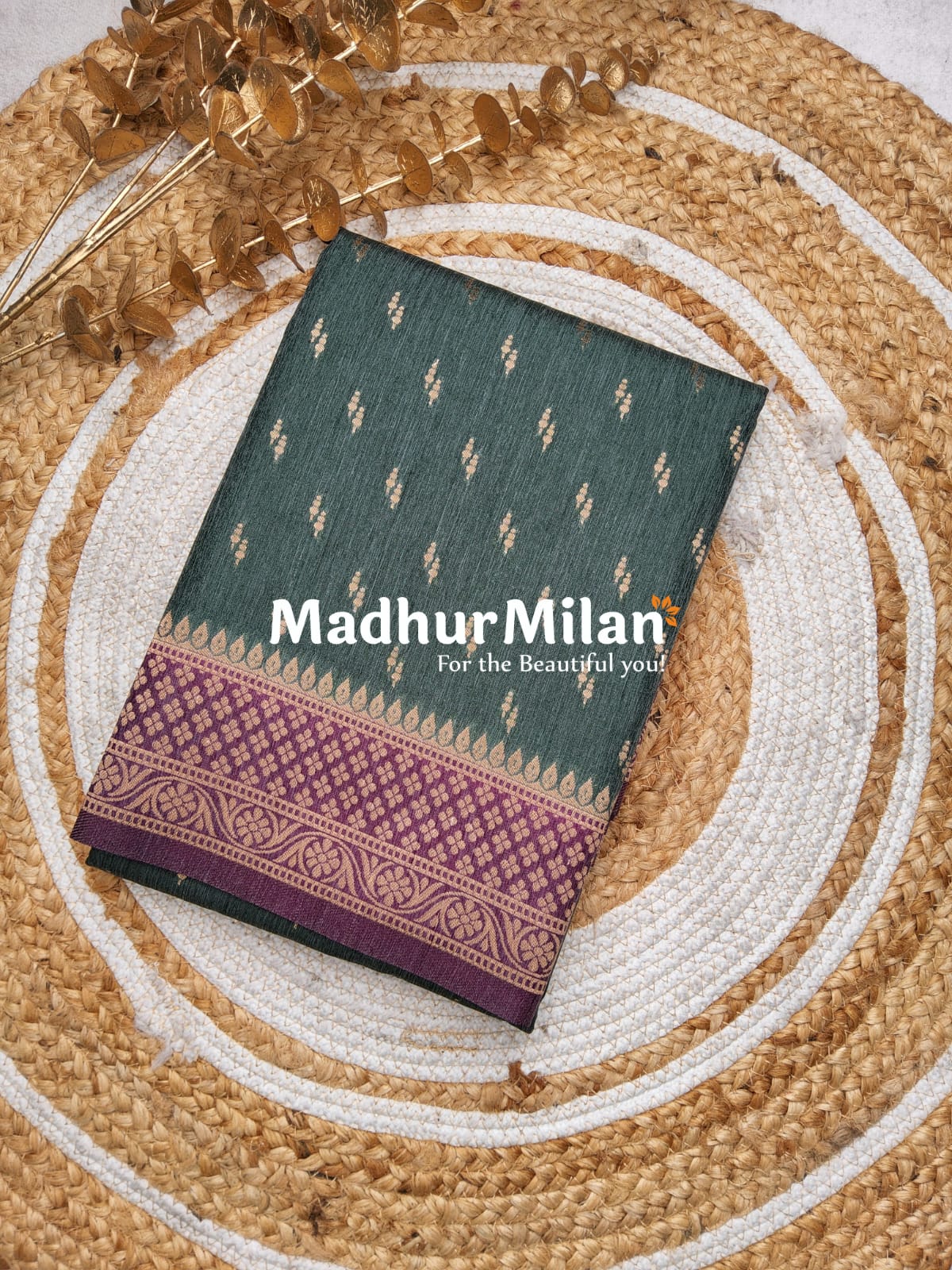 Description: Immerse yourself in the timeless elegance of our BANARASI COTTON LOOMS DUSTY GREEN IRON saree, a masterpiece from the Madhur Milan collection. This exquisite piece combines traditional Banarasi craftsmanship with contemporary design, perfect for the modern woman who appreciates classic beauty.