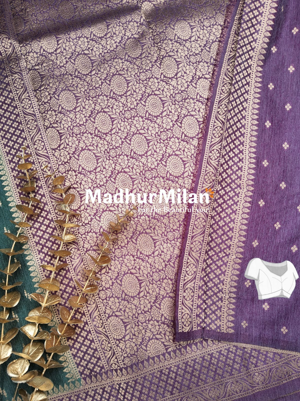 The saree's body showcases a dusty green hue, embellished with delicate golden motifs that resemble small diamonds, adding a touch of sparkle to the overall look. The contrasting purple border and pallu create a beautiful harmony of colors, making this saree suitable for various occasions. The purple border and pallu feature intricate golden zari work, displaying traditional Banarasi patterns including floral motifs, paisleys, and geometric designs. This detailed craftsmanship adds a royal touch to the saree, making it perfect for special events and festivals. Crafted from high-quality cotton, this saree offers both comfort and style, making it ideal for all-day wear. The fabric's texture and fall ensure a graceful drape, flattering various body types. Complete your look with the matching blouse piece included, which can be customized to your preference. Whether you're attending a wedding, festival, or formal event, the BANARASI COTTON LOOMS DUSTY GREEN IRON saree from Madhur Milan is sure to make you stand out with its timeless elegance and superior craftsmanship.