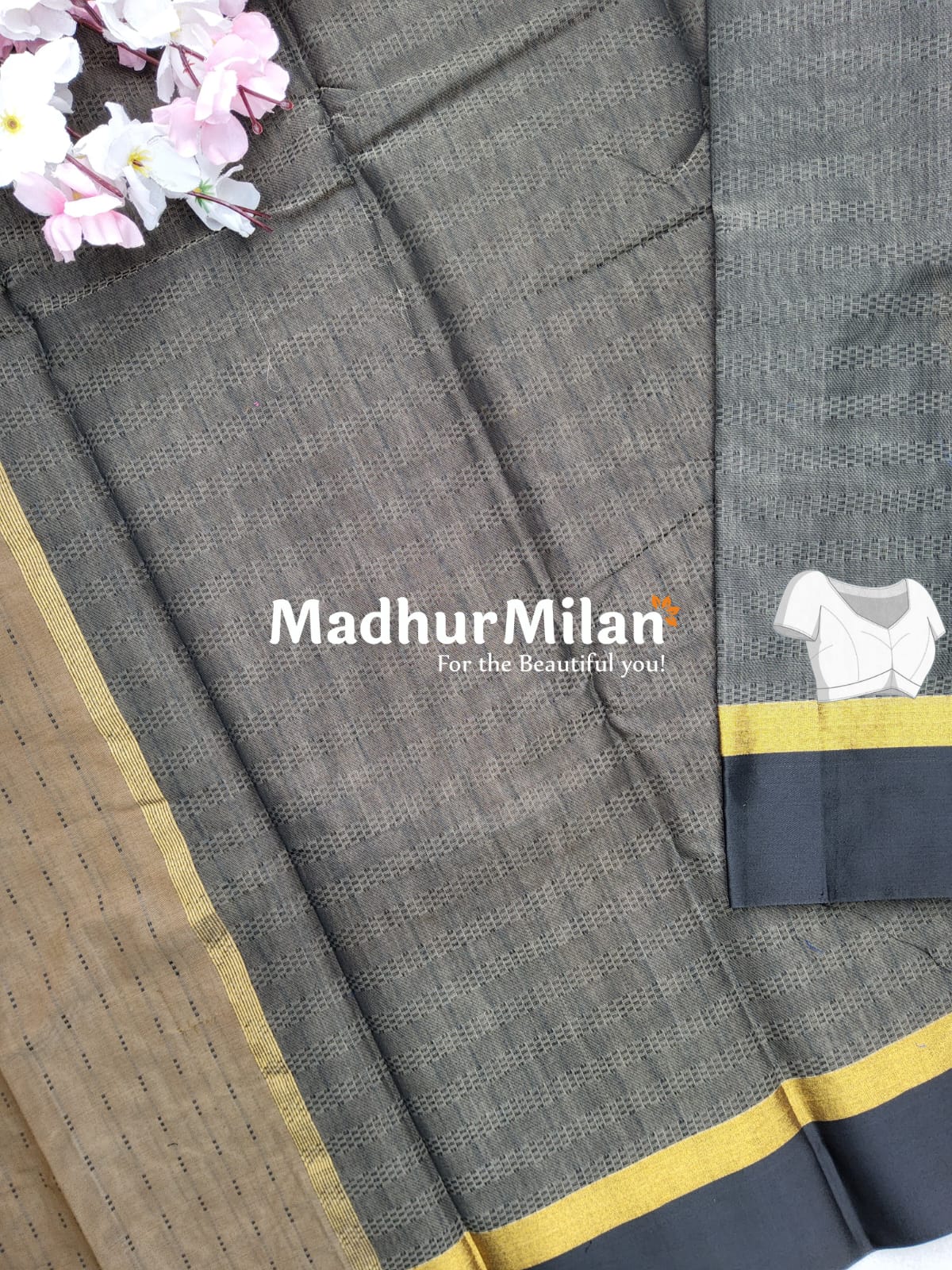 The saree's body showcases a refined brown hue with an intricate checkered weave, creating a subtle yet captivating visual appeal. The carefully crafted dotted lines running vertically add an element of sophistication to the overall design. The saree is beautifully enhanced by a lustrous gold zari border, which provides a perfect contrast to the earthy brown tone. The pallu features a deep black shade, creating a stunning visual balance and adding a touch of drama to the ensemble.