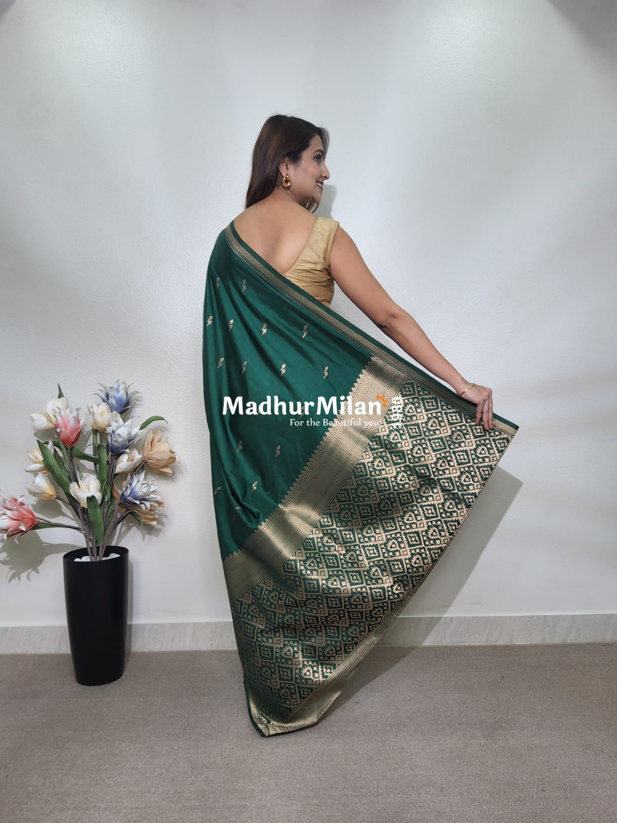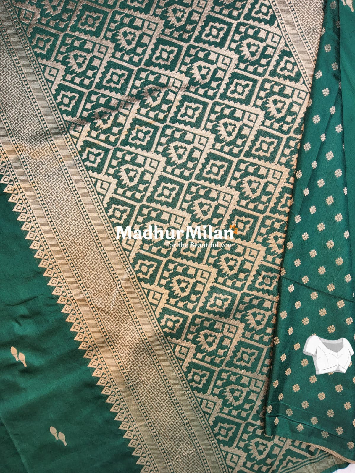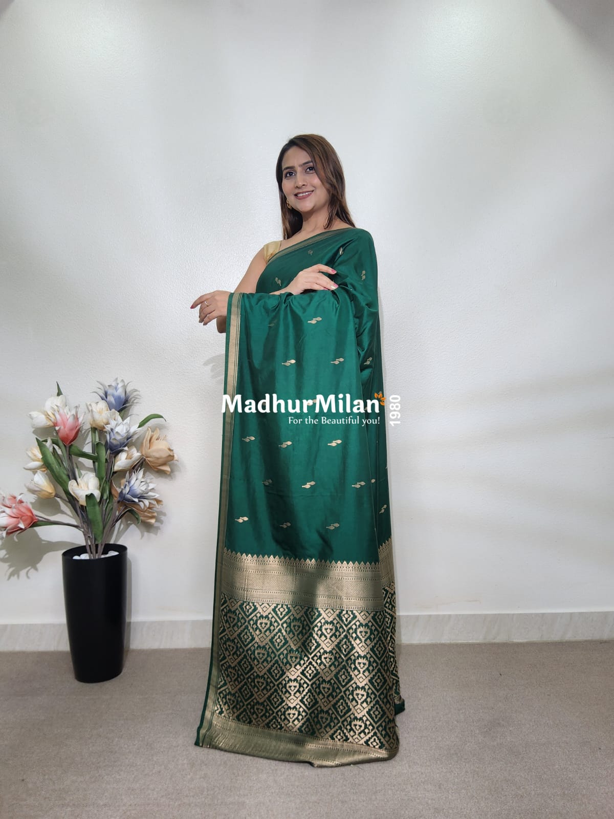 Elevate your ethnic wardrobe with this exquisite Tulsi Malai Silk Saree in a captivating dark green shade. Crafted by Madhur Milan, this saree embodies elegance and tradition, perfect for the beautiful you!