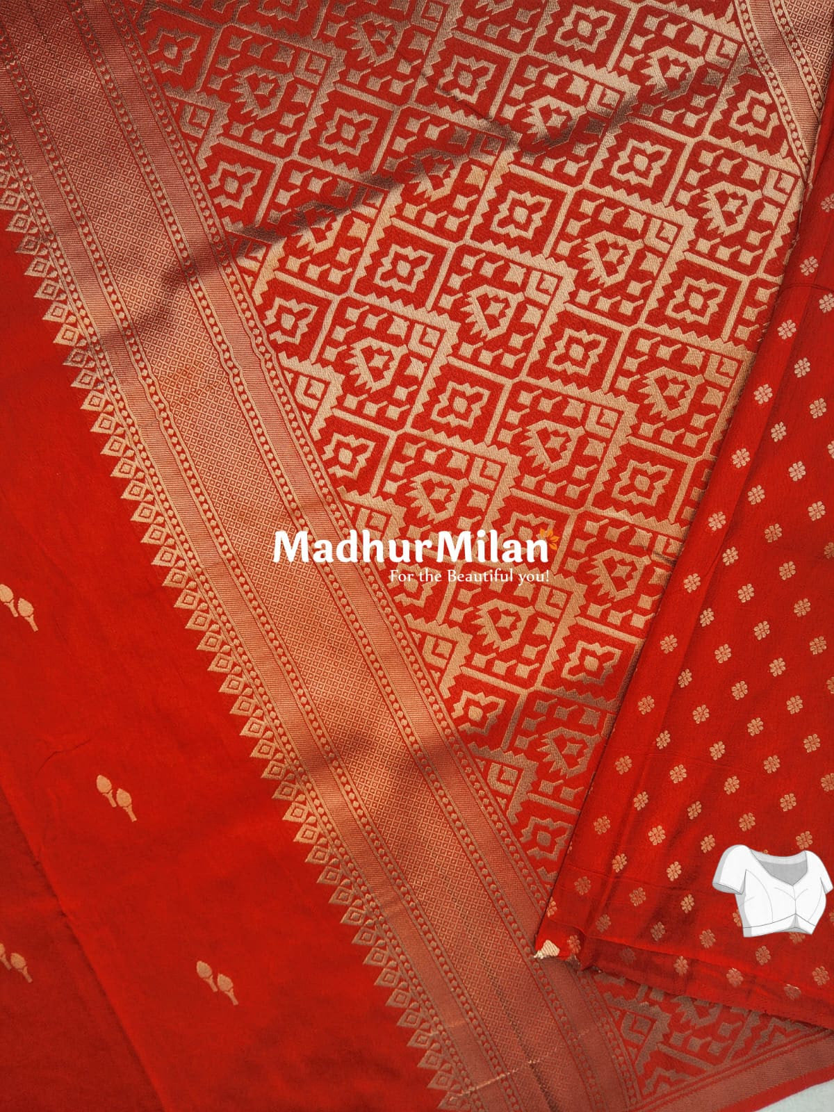 3. Design: - Body: Adorned with delicate golden motifs resembling Tulsi leaves, scattered elegantly across the saree. - Pallu: Features an intricate geometric pattern in gold zari work, creating a stunning contrast against the red background. - Border: A wide, ornate border with traditional designs enhances the saree's overall appeal.