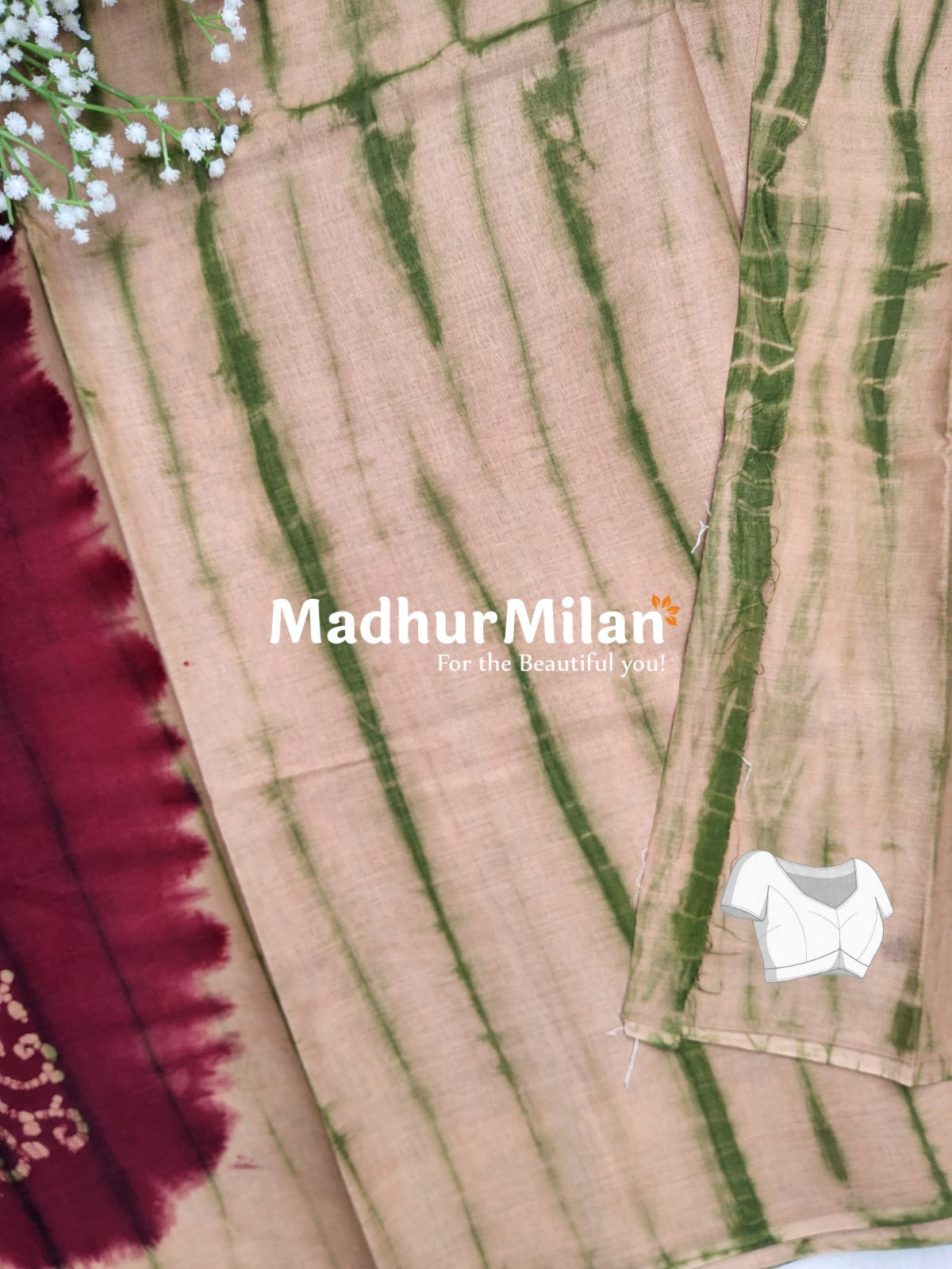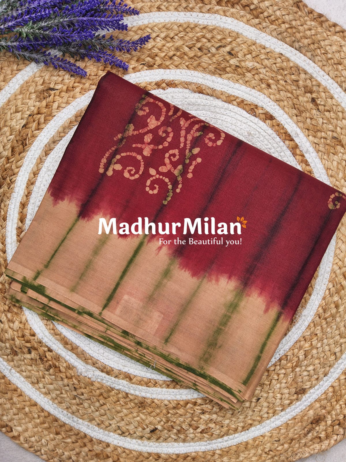 The saree boasts a striking combination of colors, with a deep maroon body gradually transitioning to a beige shade, adorned with green vertical stripes. The batik printing technique adds depth and character to the fabric, creating a visually appealing texture. The upper portion of the saree showcases an intricate floral design in a lighter shade, adding a touch of elegance to the overall look. The pallu features a harmonious blend of maroon, beige, and green hues, creating a stunning visual contrast.