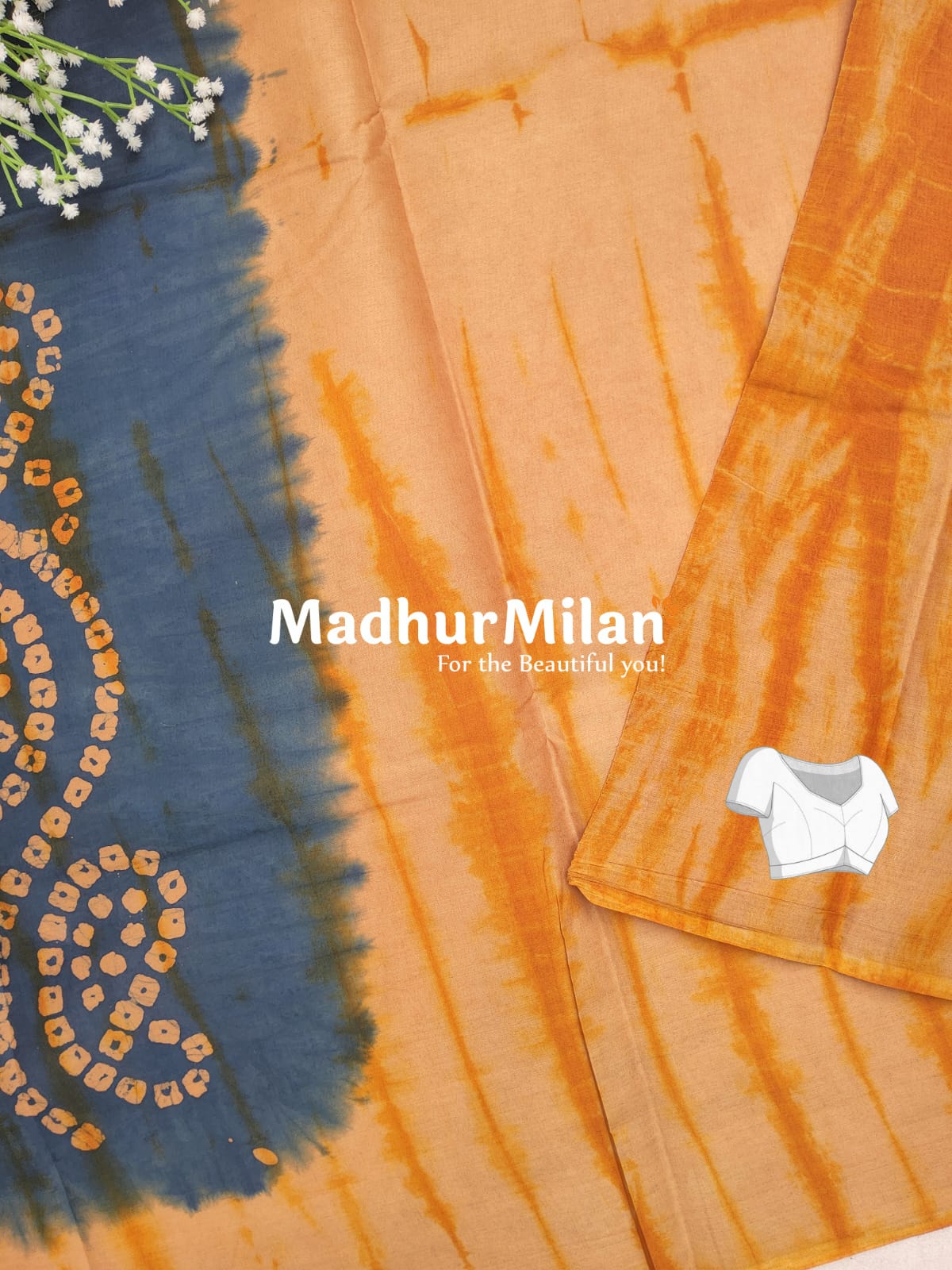 The saree showcases a captivating batik print with circular motifs in orange, artfully arranged on a deep blue background. The lower portion of the saree transitions into a vibrant orange, creating a beautiful ombré effect. This color combination is not only eye-catching but also versatile, suitable for various occasions. The cotton fabric ensures that the saree is comfortable to wear, making it perfect for both casual outings and formal events. The batik printing technique adds a layer of uniqueness to each piece, making your saree one-of-a-kind.