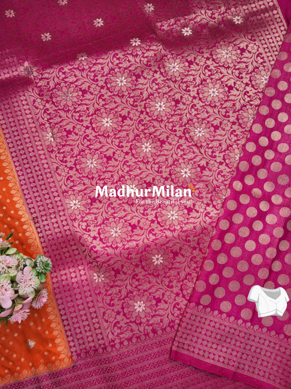 Description: Elevate your ethnic wardrobe with the stunning INAAYA BANARASI BLOOMS SAREE in a captivating orange and pink color combination. This exquisite saree from Madhur Milan is a perfect blend of traditional craftsmanship and contemporary style.