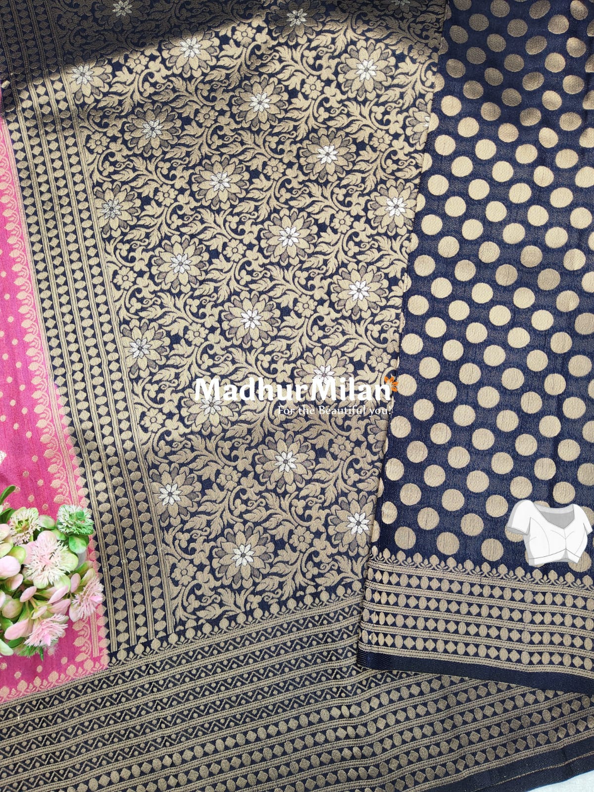 Elevate your ethnic wardrobe with this exquisite Inaaya Banarasi Blooms Saree in a stunning combination of pink and navy blue. This masterpiece from MadhurMilan is crafted for the beautiful you, blending traditional artistry with contemporary elegance.