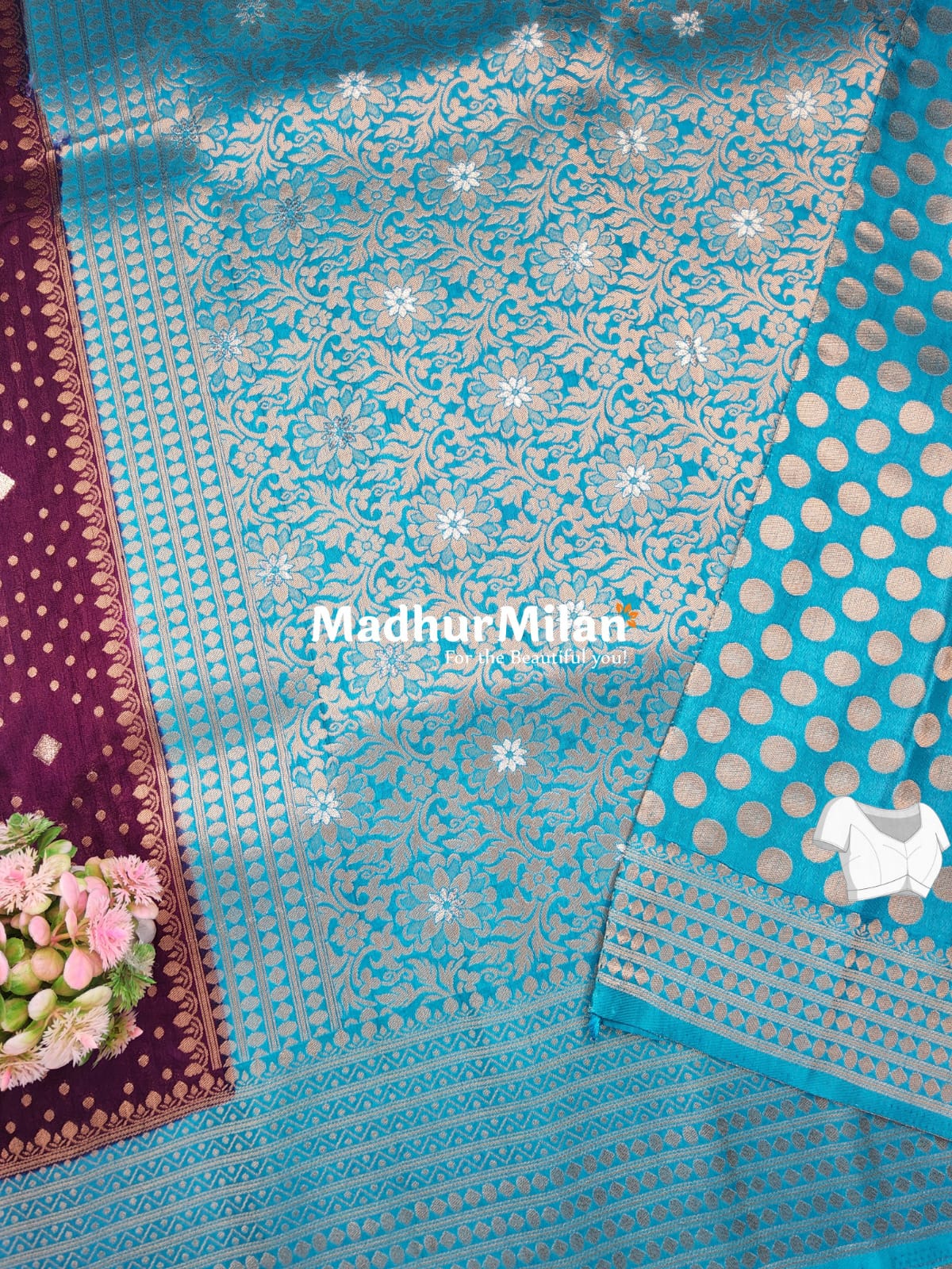 1. Exquisite Dual-Tone Design: This saree features a captivating combination of rich wine and vibrant Bondi blue, creating a striking contrast that's sure to turn heads.