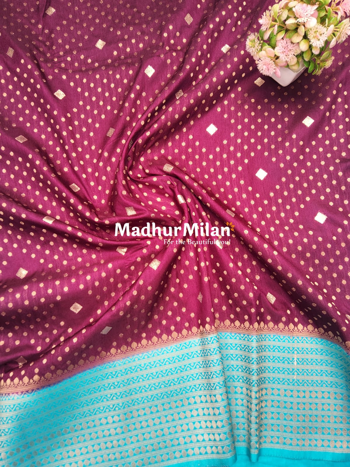 3. Intricate Zari Work: The wine-colored body is adorned with delicate golden zari dots and square motifs, adding a touch of sparkle and sophistication.